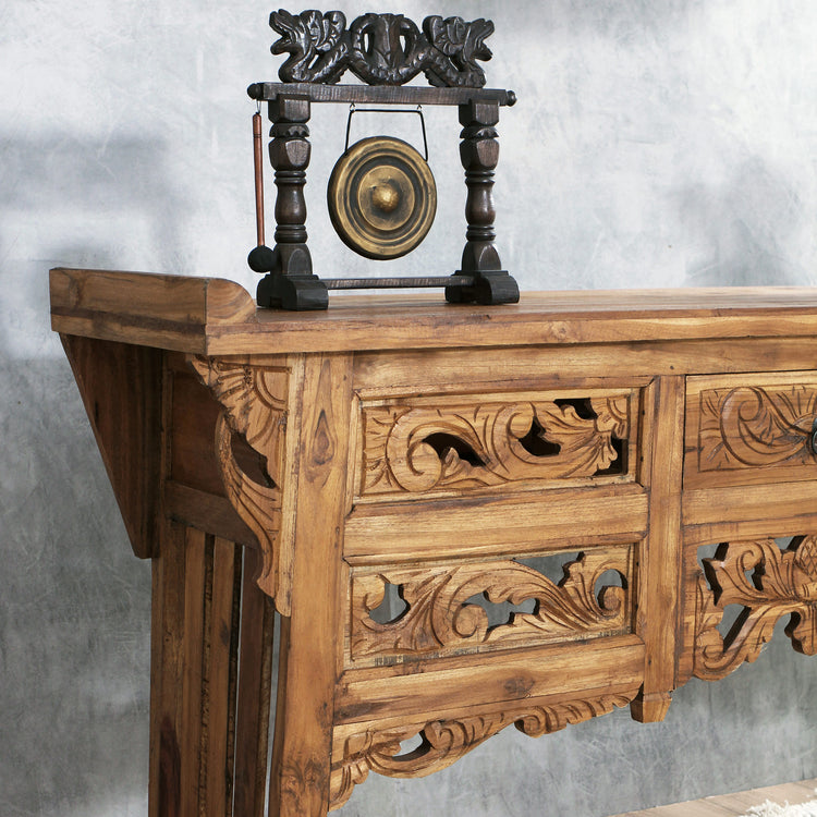 Aparador Ukir 150CM, feito em madeira teca com uma gavetas e detalhes talhados à mão.