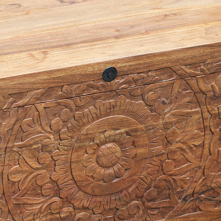 O Baú Paisa tem painel único entalhado artesanalmente, com suporte em ferro.