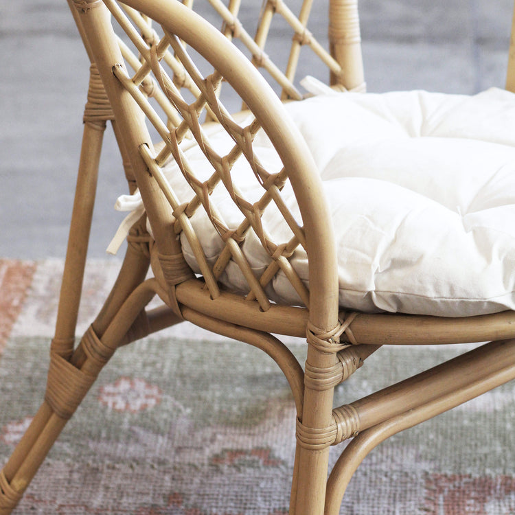 A Cadeira Olívia combina a beleza natural do rattan e do bambu com o conforto do assento acolchoado, criando uma peça de mobiliário elegante e funcional com design envolvente e confortável.