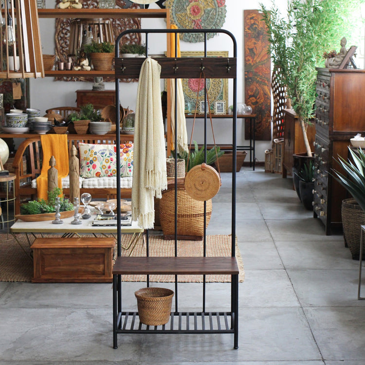 Chapeleira Sapateira Tricia produzida em aço carbono com pintura eletrostática e madeira maciça Taeda proveniente de reflorestamento. Com ganchos na parte superior e sapateira na parte inferior é ideal para o hall de entrada.