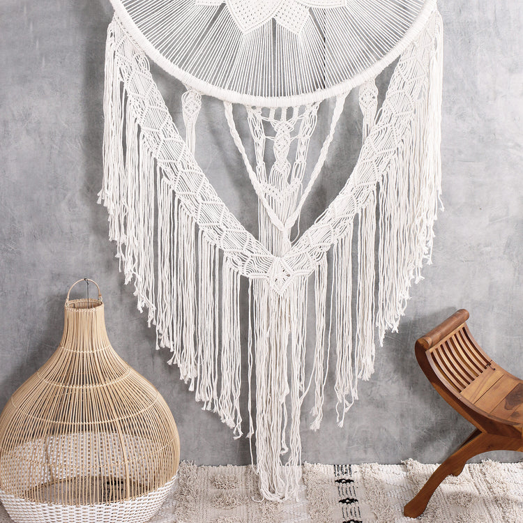 Mandala Macramê Flor Besar, com trabalho artesanal em Macramê. Feita em algodão e estrutura em madeira, ela vem da ilha de Bali.
