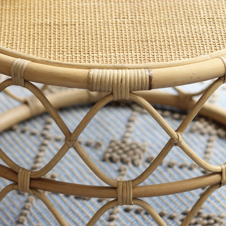 Mesa Sumba, desenho leve, ela conta com um tampo trançado e estrutura em ratam artesanal.