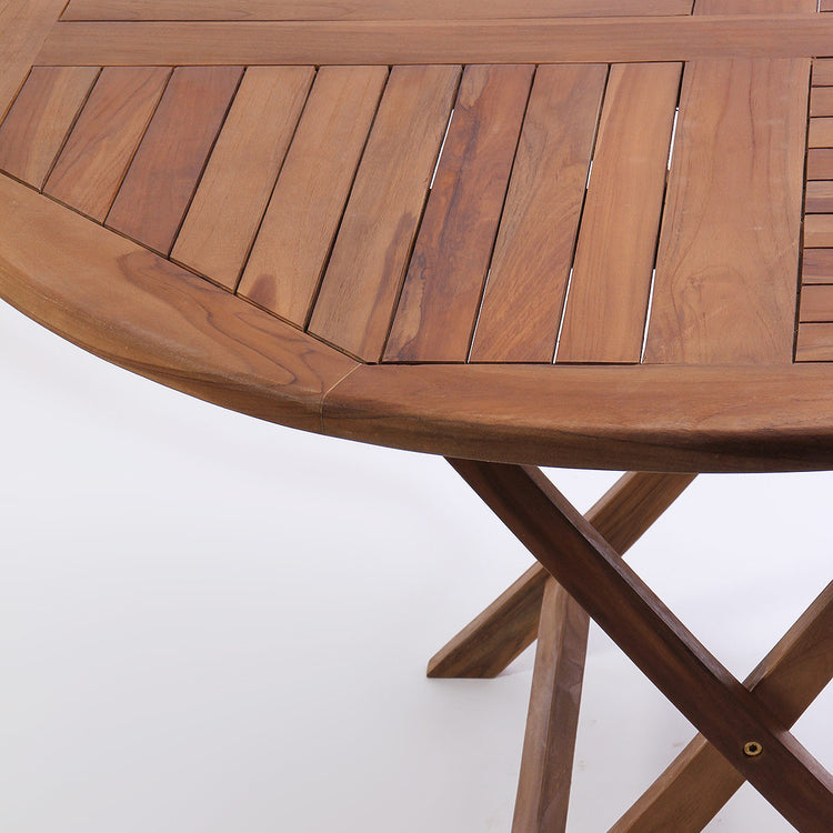 Mesa clássica para áreas externas, com pernas dobráveis e elementos internos em metal inoxidável. Feita em Teca maciça.