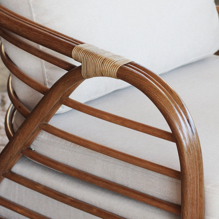 Poltrona Niyat, é toda trabalhada á mão, braços curvos em apuí com detalhes trançados em junco.