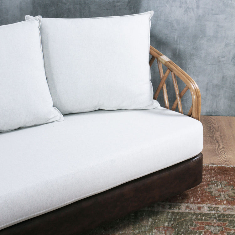 Sofá Dian 3 Lugares, é todo trabalhado á mão, braços curvos em apuí com detalhes trançados em junco e base em couro.