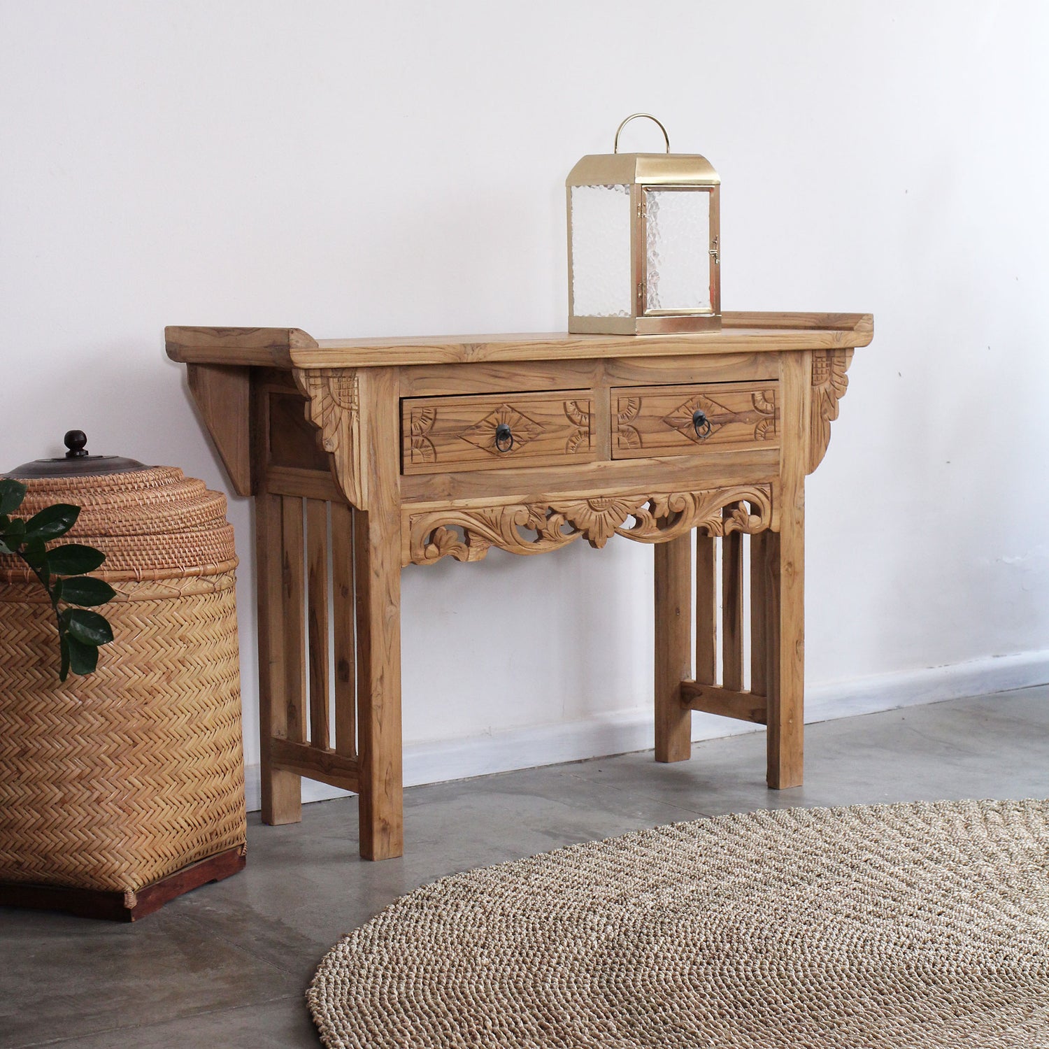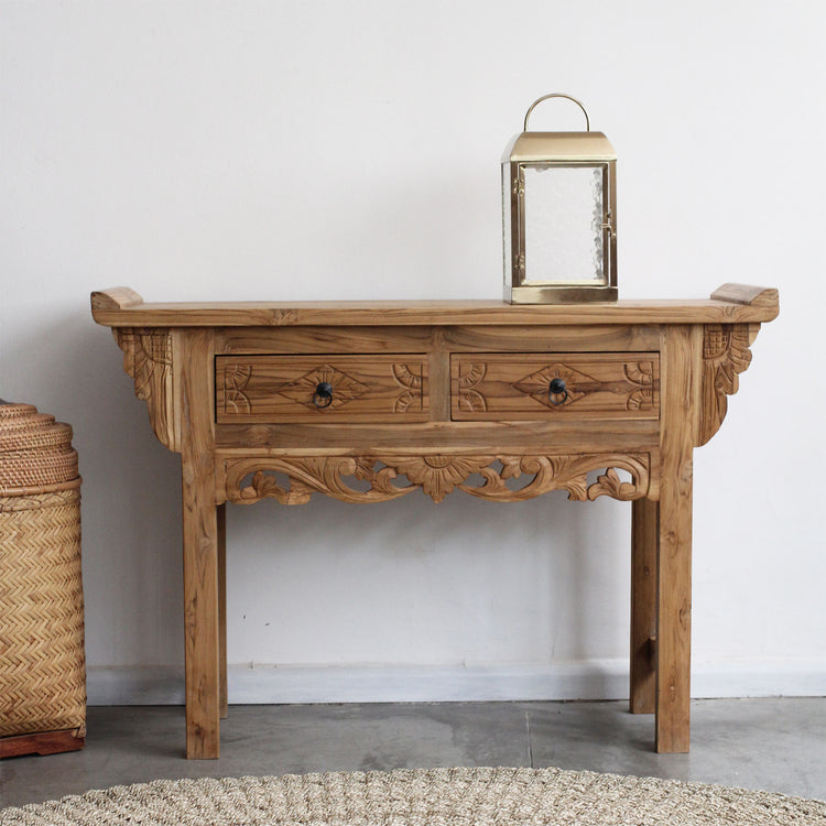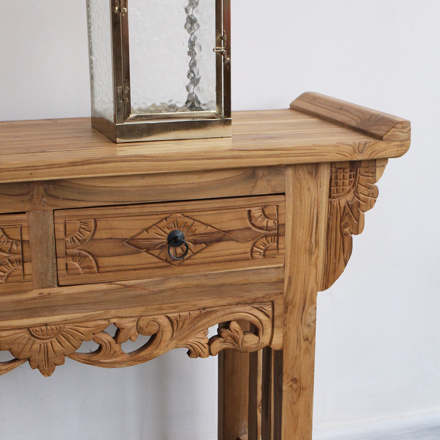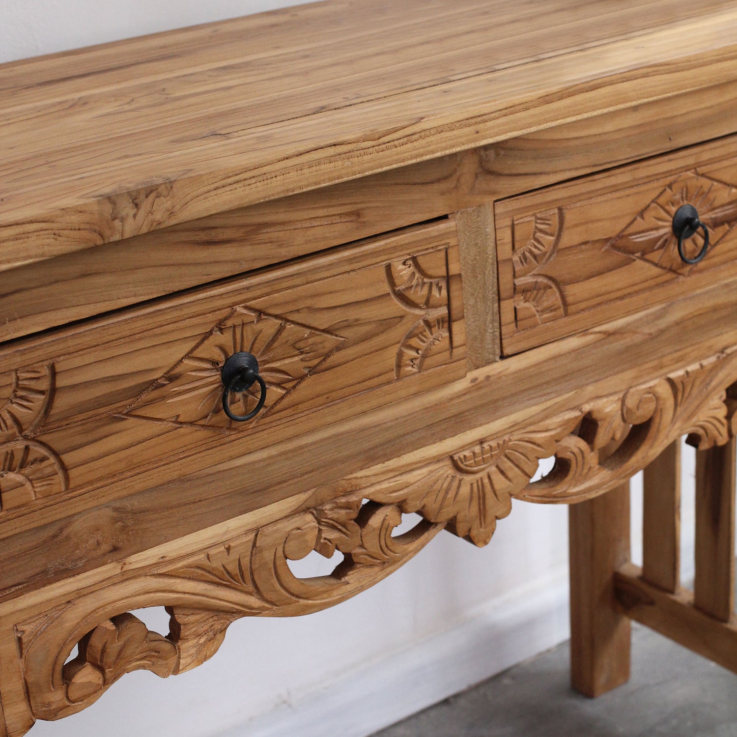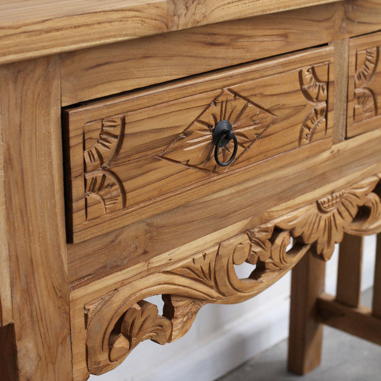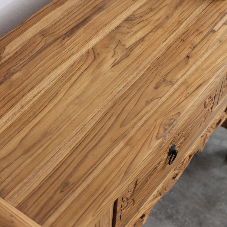 Aparador Candra 120CM, feito em madeira teca com duas gavetas e detalhes talhados à mão.