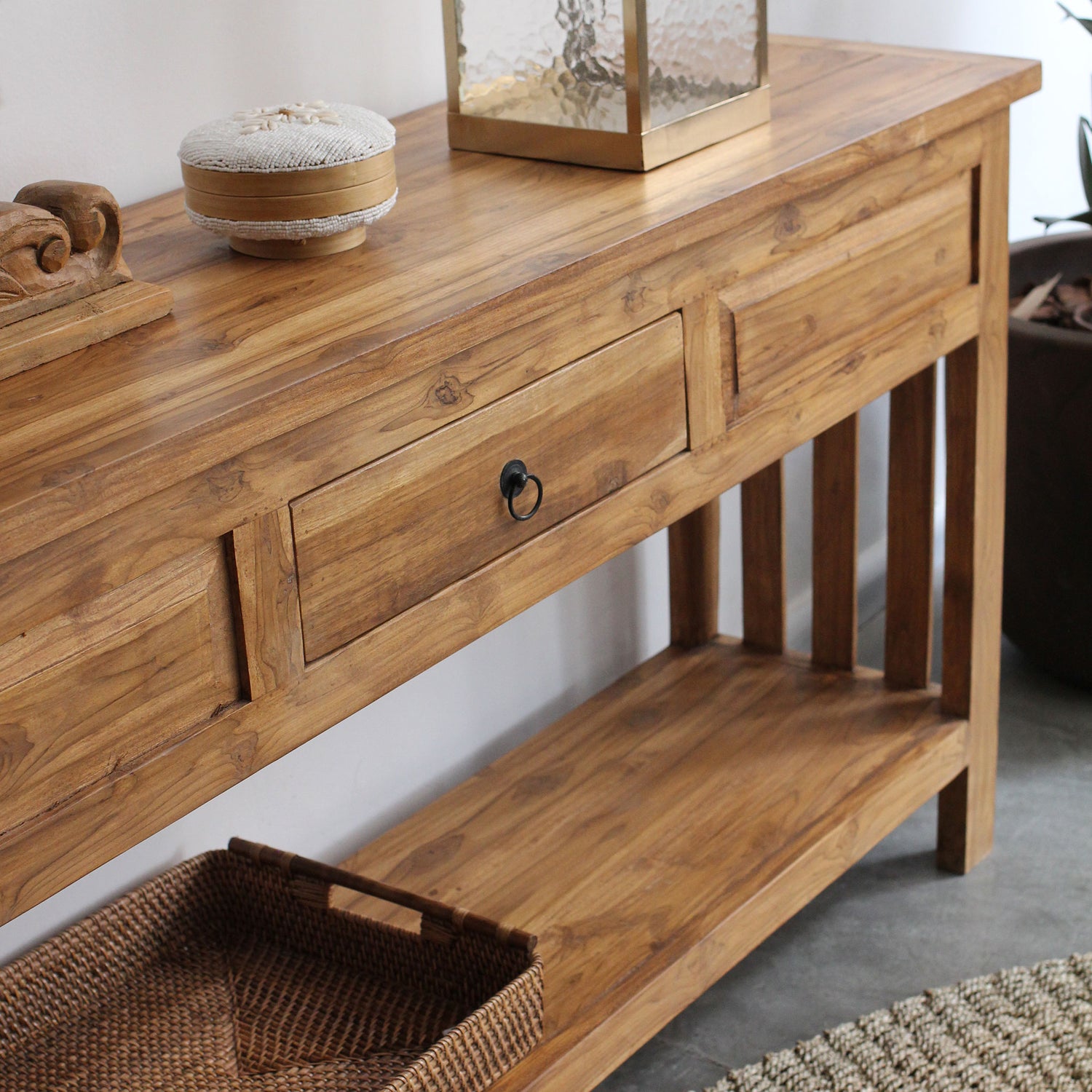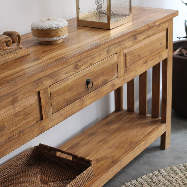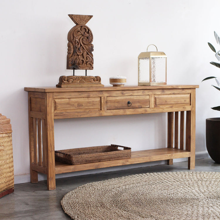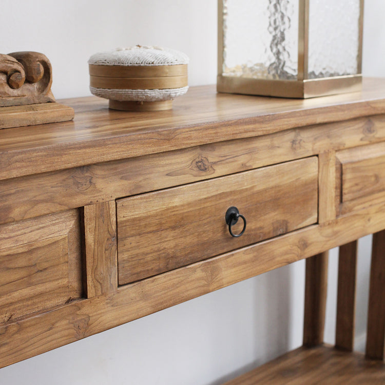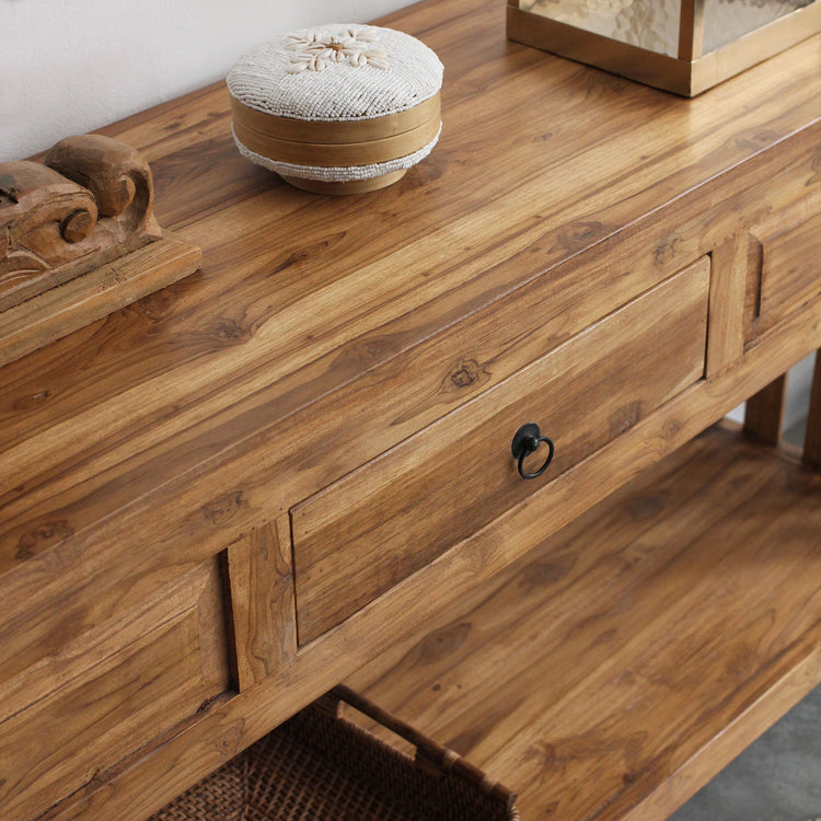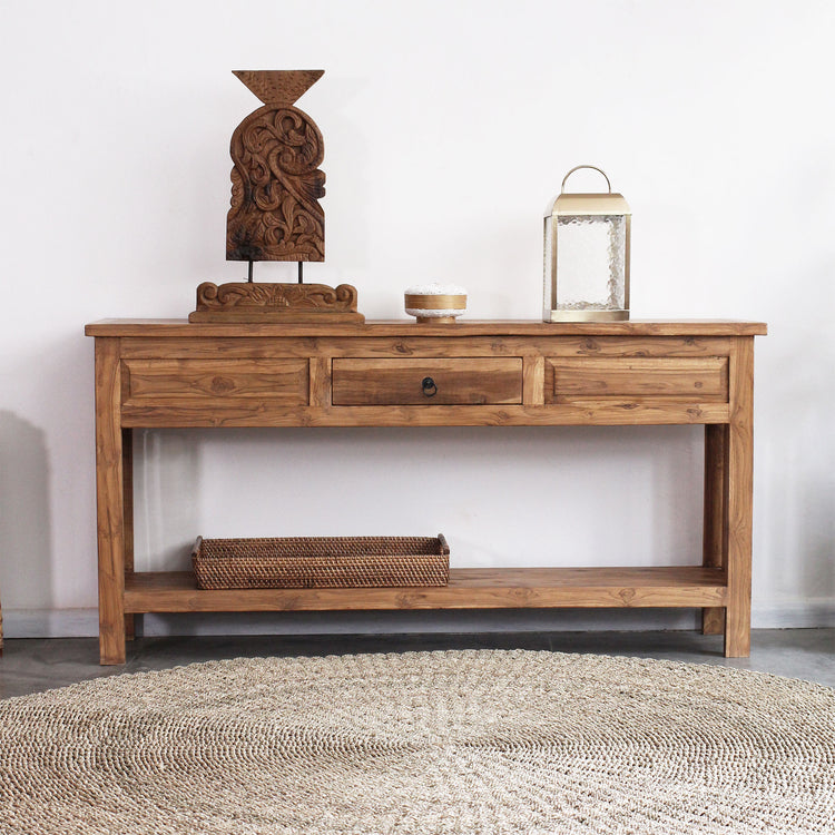 Aparador Jelita 160CM, feito em madeira teca com uma gaveta e detalhes talhados à mão.