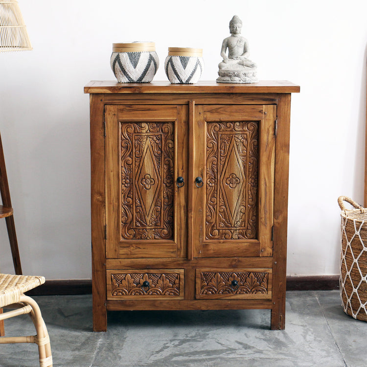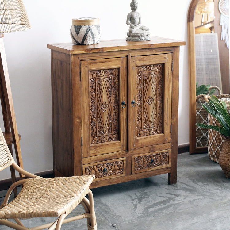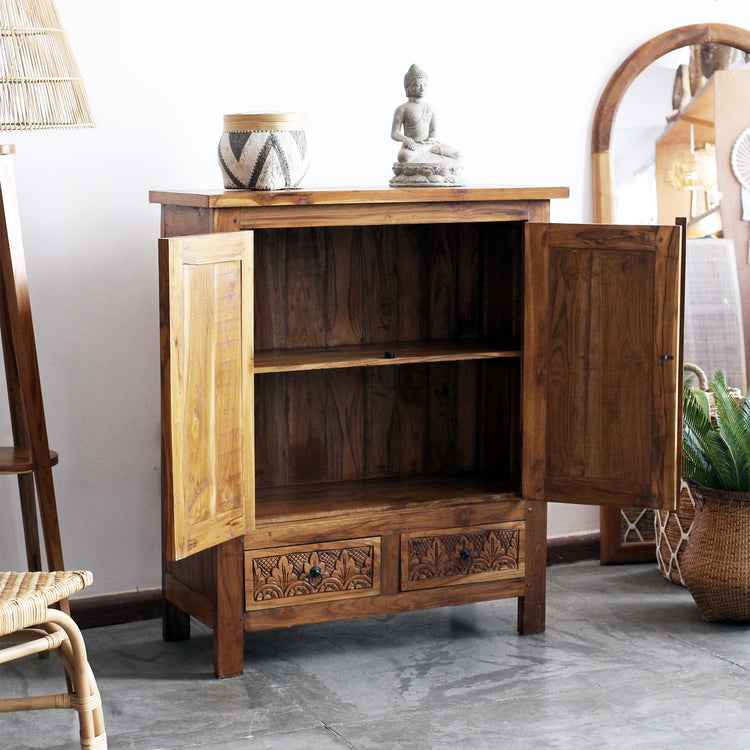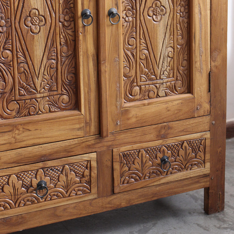 Gabinete Empat feito em madeira teca maciça com detalhes talhados à mão.