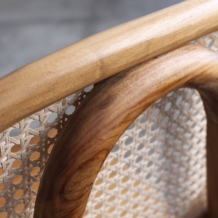 Com desenho arredondado e assento curvo, a Cadeira Nina tem construção sólida e ao mesmo tempo delicada com seu encosto em rattan trançado. O resultado visual é leve, despretensioso e elegante. Feita em madeira teca maciça.