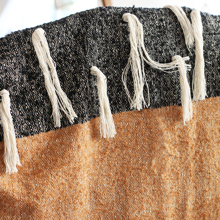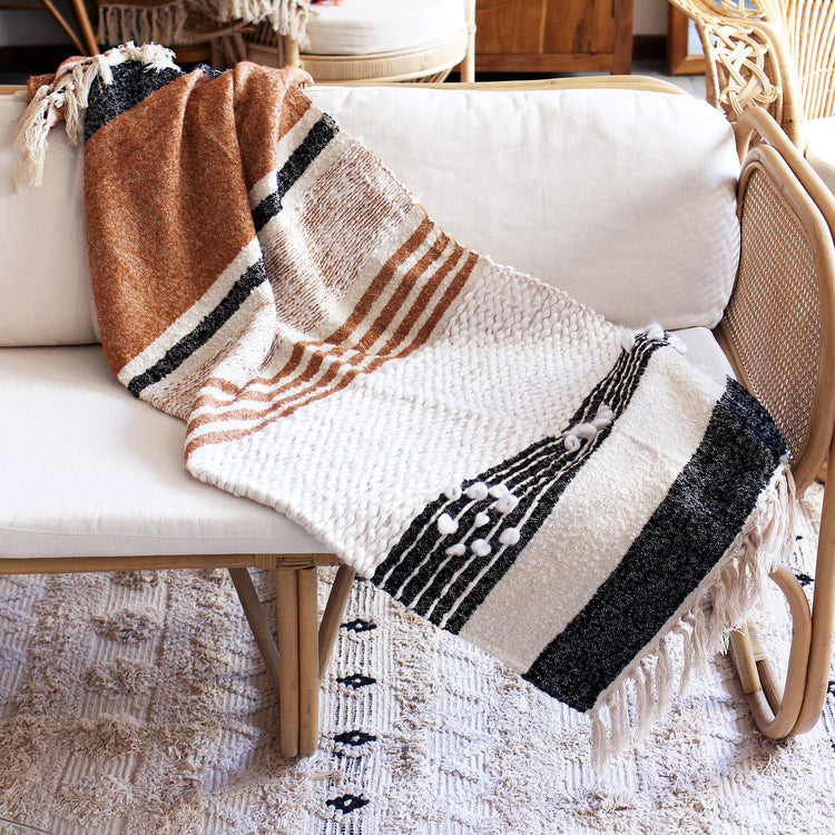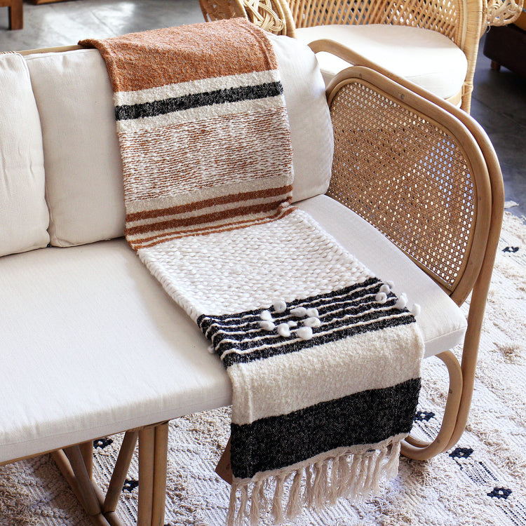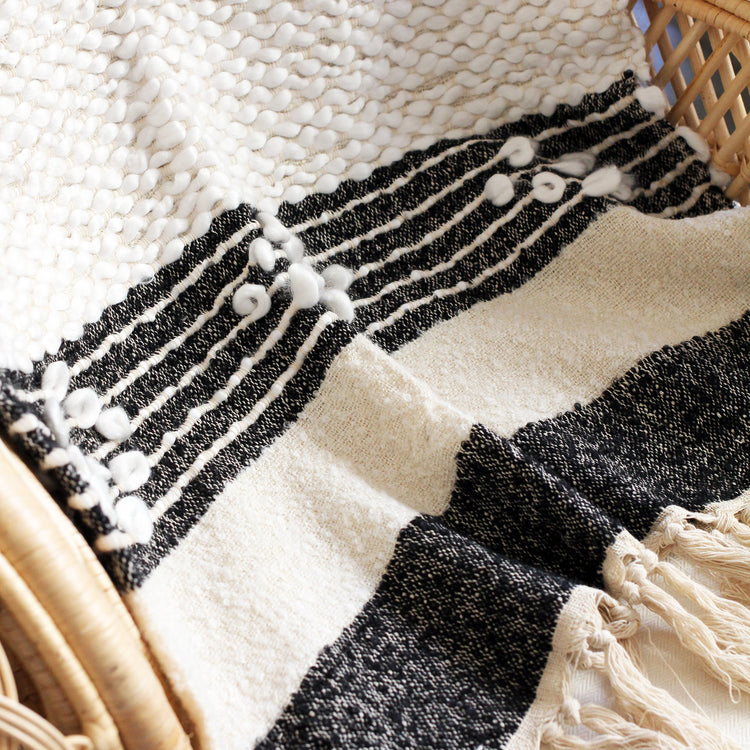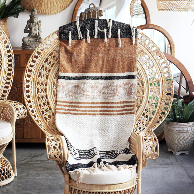 Manta Ana produzida com uma mescla de viscose e algodão com padronagens complexas de entrelaçamento, com toque, brilho e contraste superior.