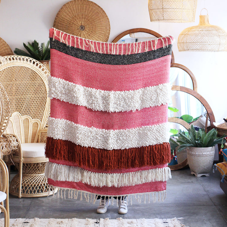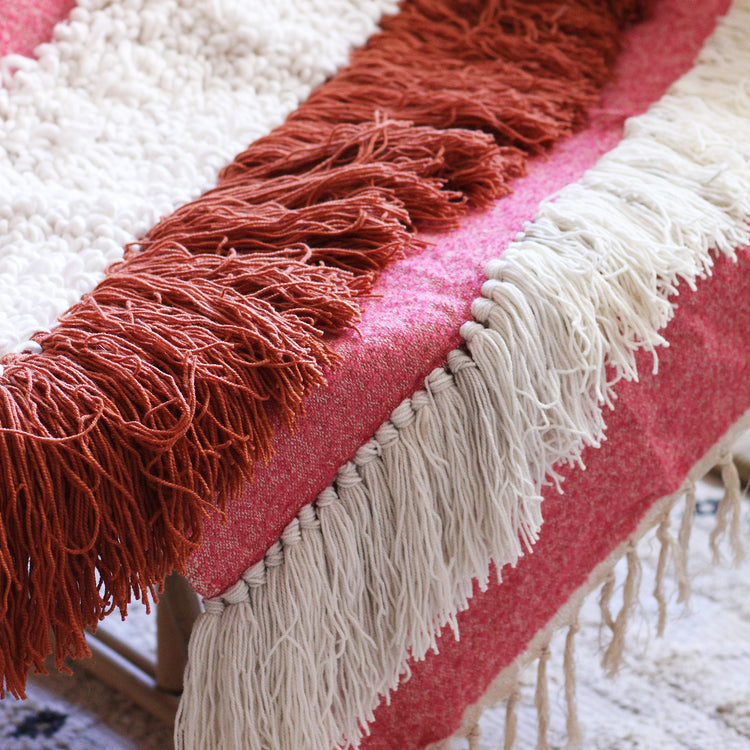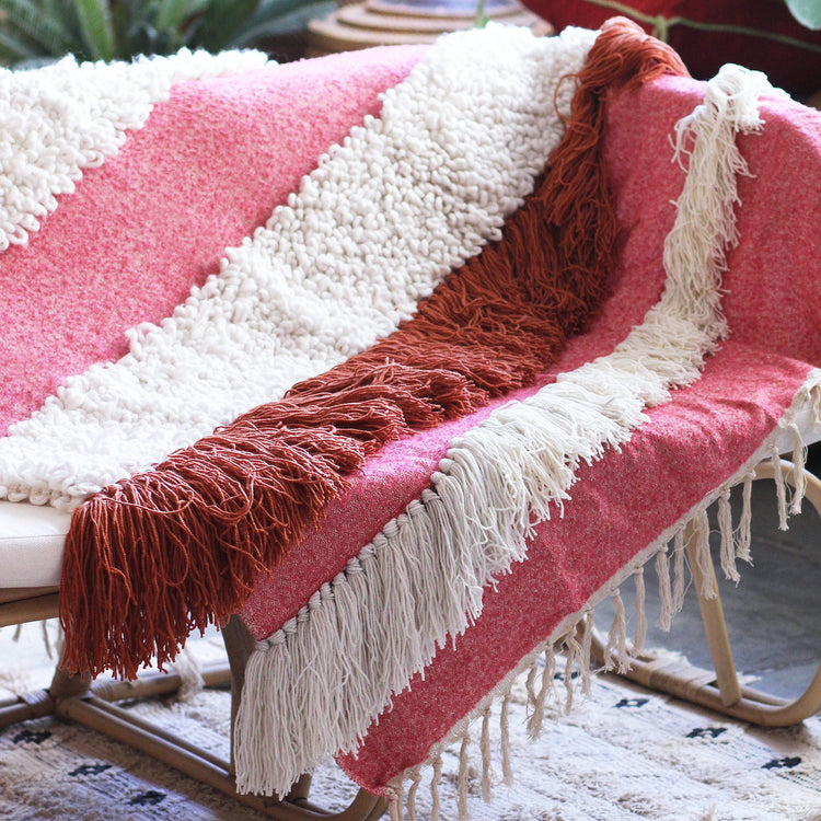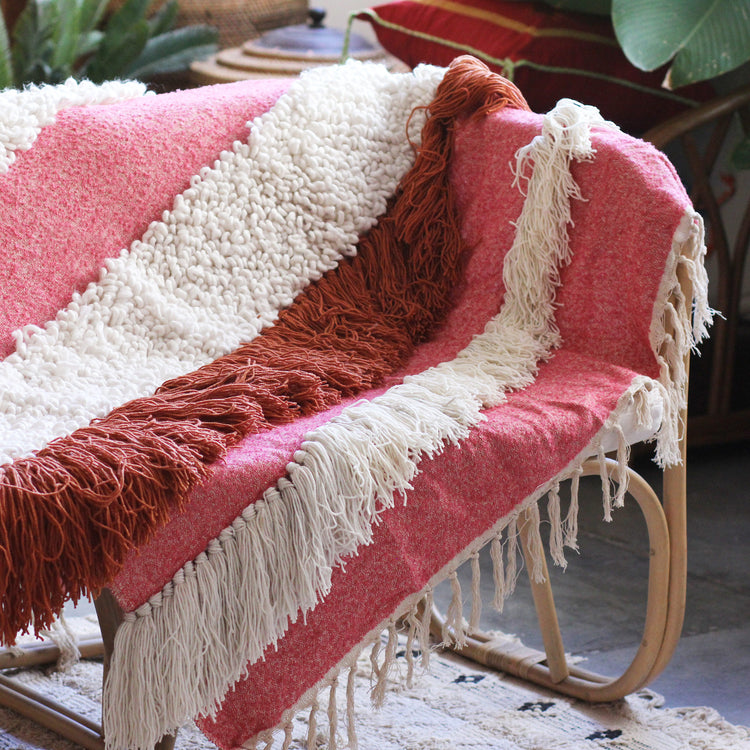 Manta Lena produzida com uma mescla de viscose e algodão com padronagens complexas de entrelaçamento, com toque, brilho e contraste superior.