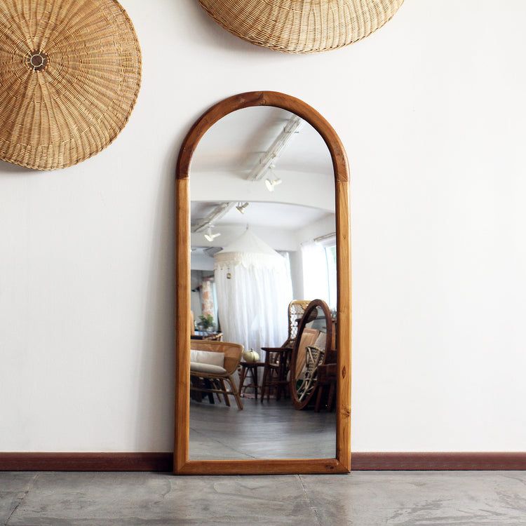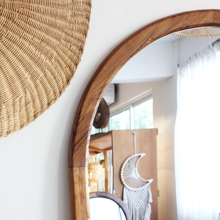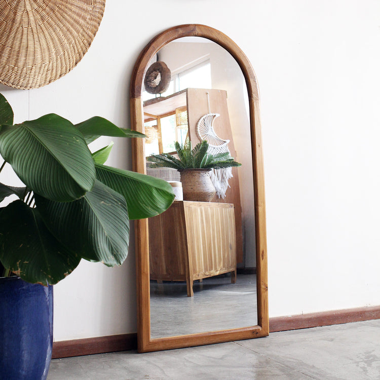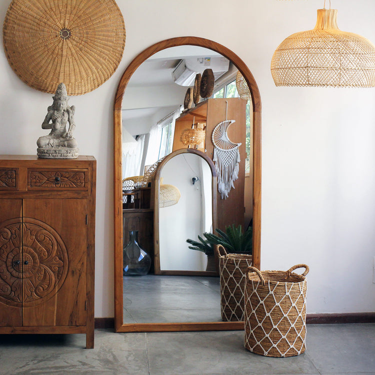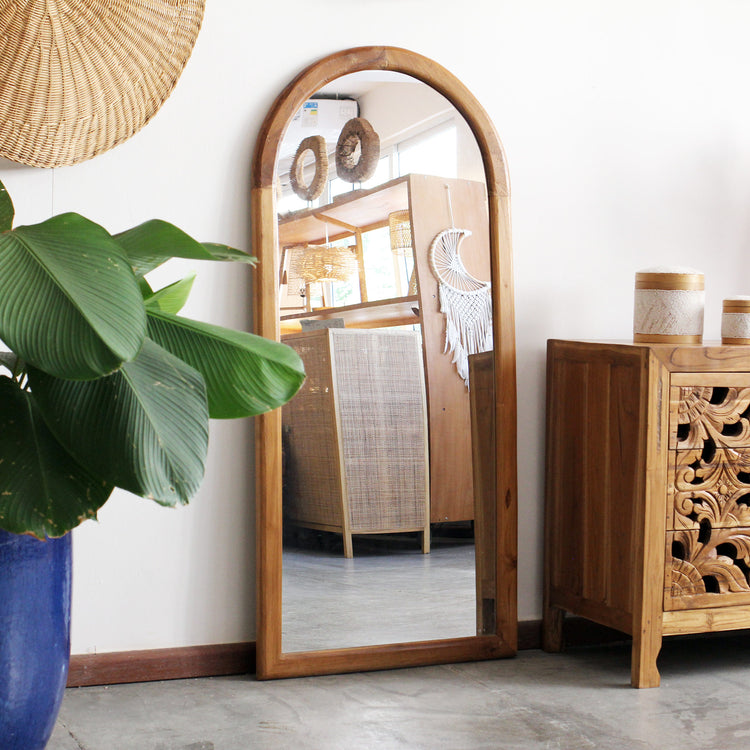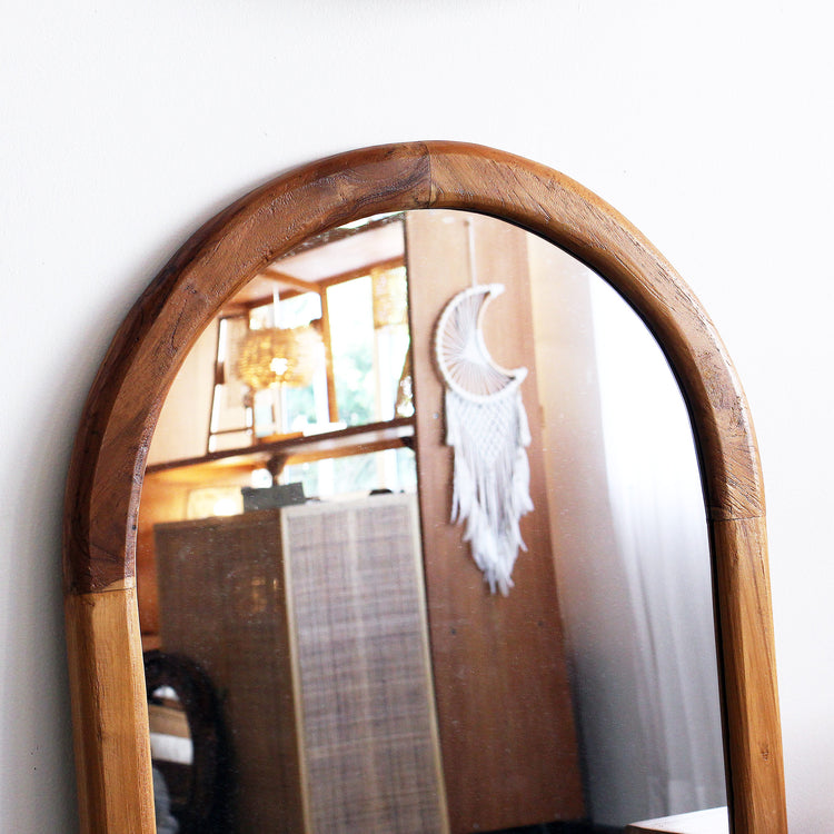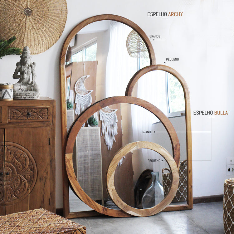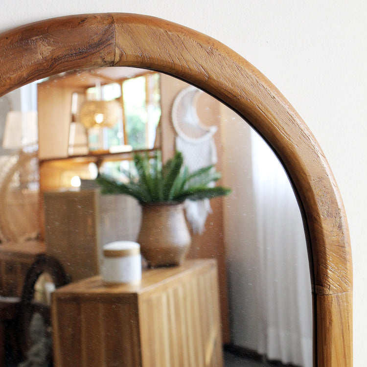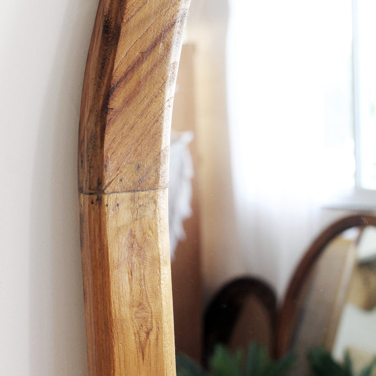 Produzido artesanalmente na Indonésia, este espelho combina beleza e funcionalidade com um design clássico e atemporal inspirado na arquitetura indonésia com sua moldura em madeira Teca rústica trabalhada à mão. Um charme para chamar atenção em qualquer ambiente.