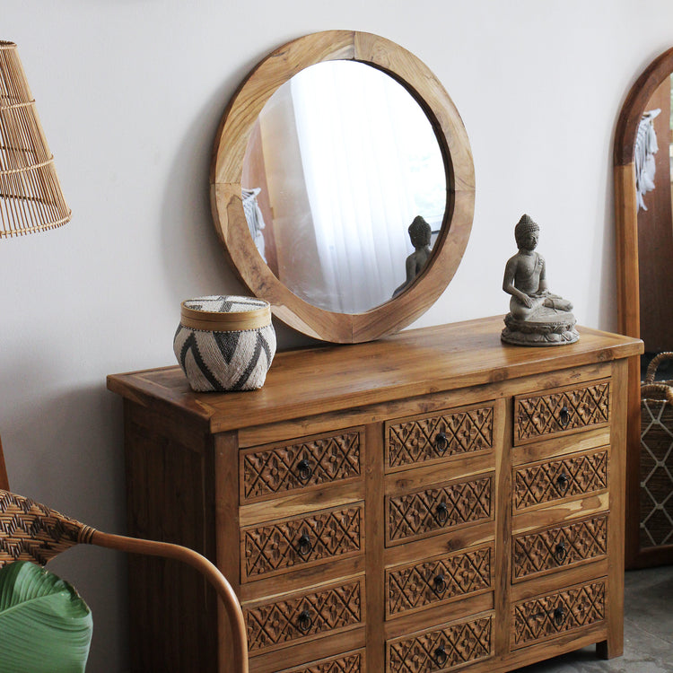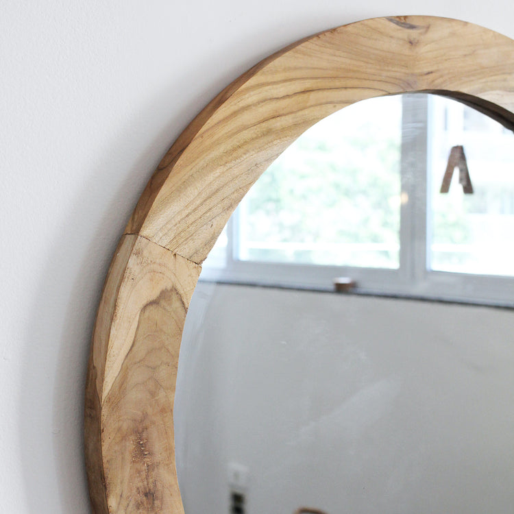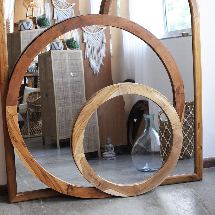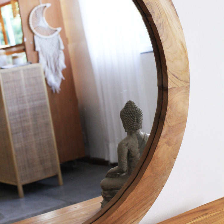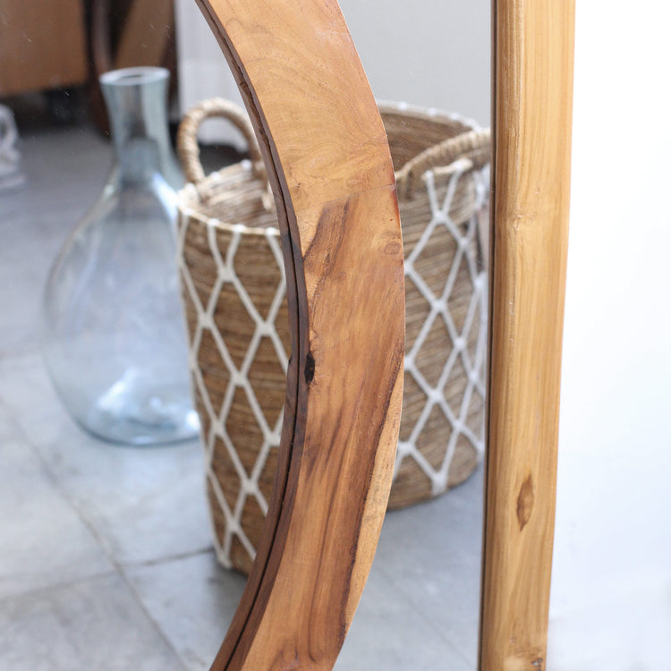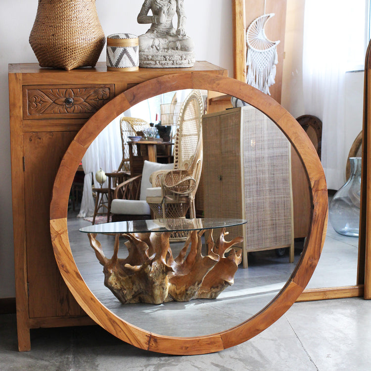 O espelho Bulat conta com dimensões generosas e muito charme. Sua moldura é feita em madeira Teca rústica e a peça combina em inúmeros tipos de ambientes e estilos.