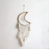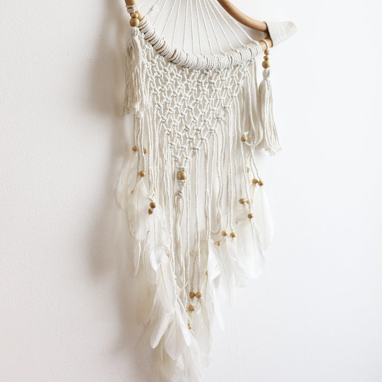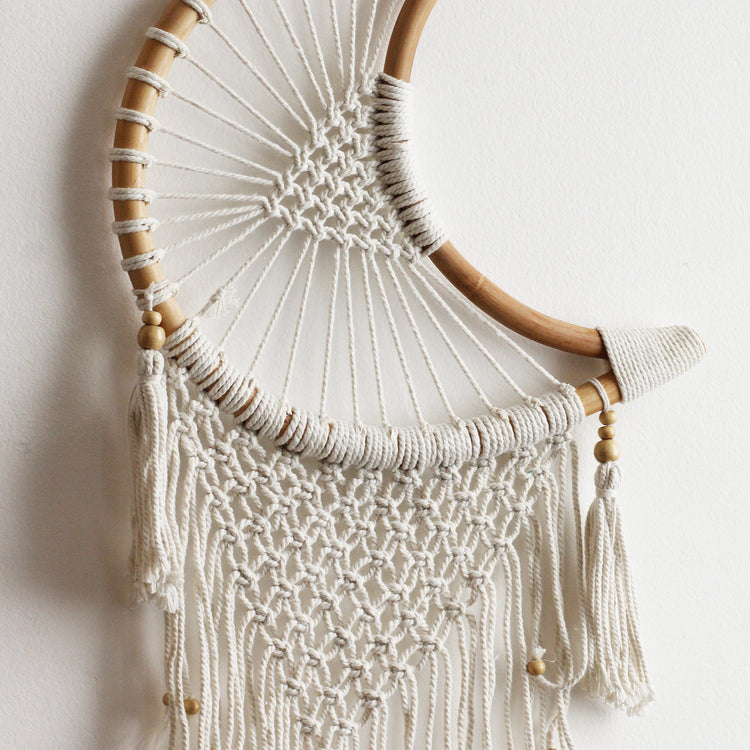 Apanhador de Sonhos Bulan, produzido artesanalmente em algodão com trabalho macramê e cintas e estrutura em madeira. Ele vem da ilha de Bali.