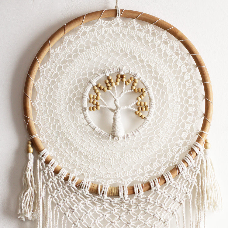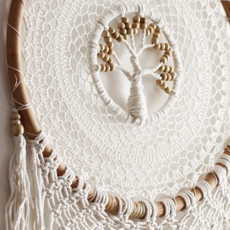 Mandala Macramê Kayu Natural, com trabalho artesanal em Macramê. Feita em algodão e estrutura em madeira, ela vem da ilha de Bali.