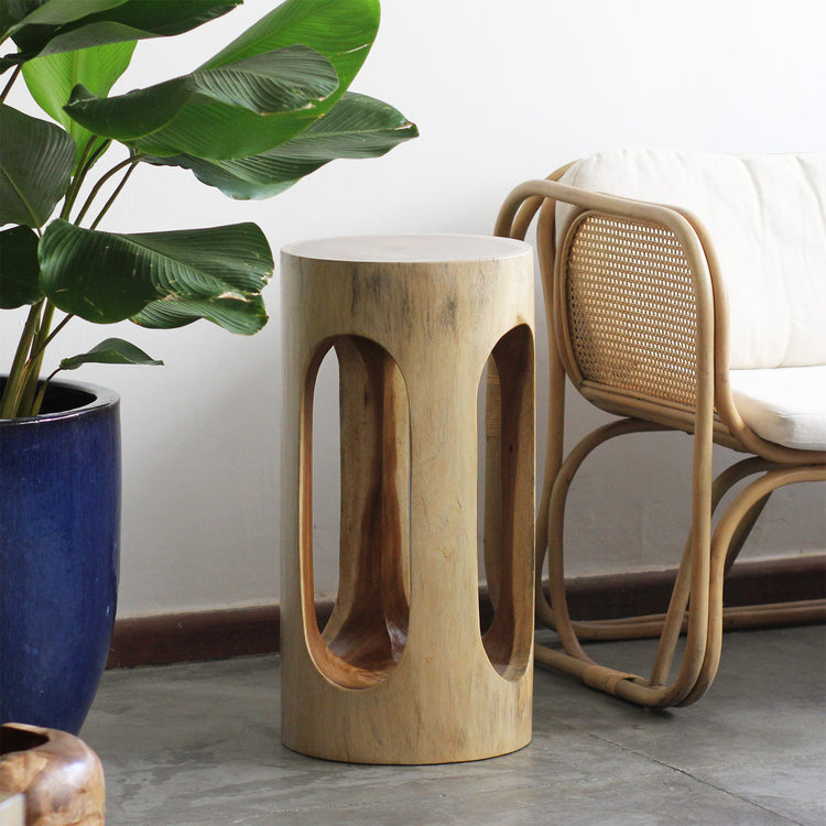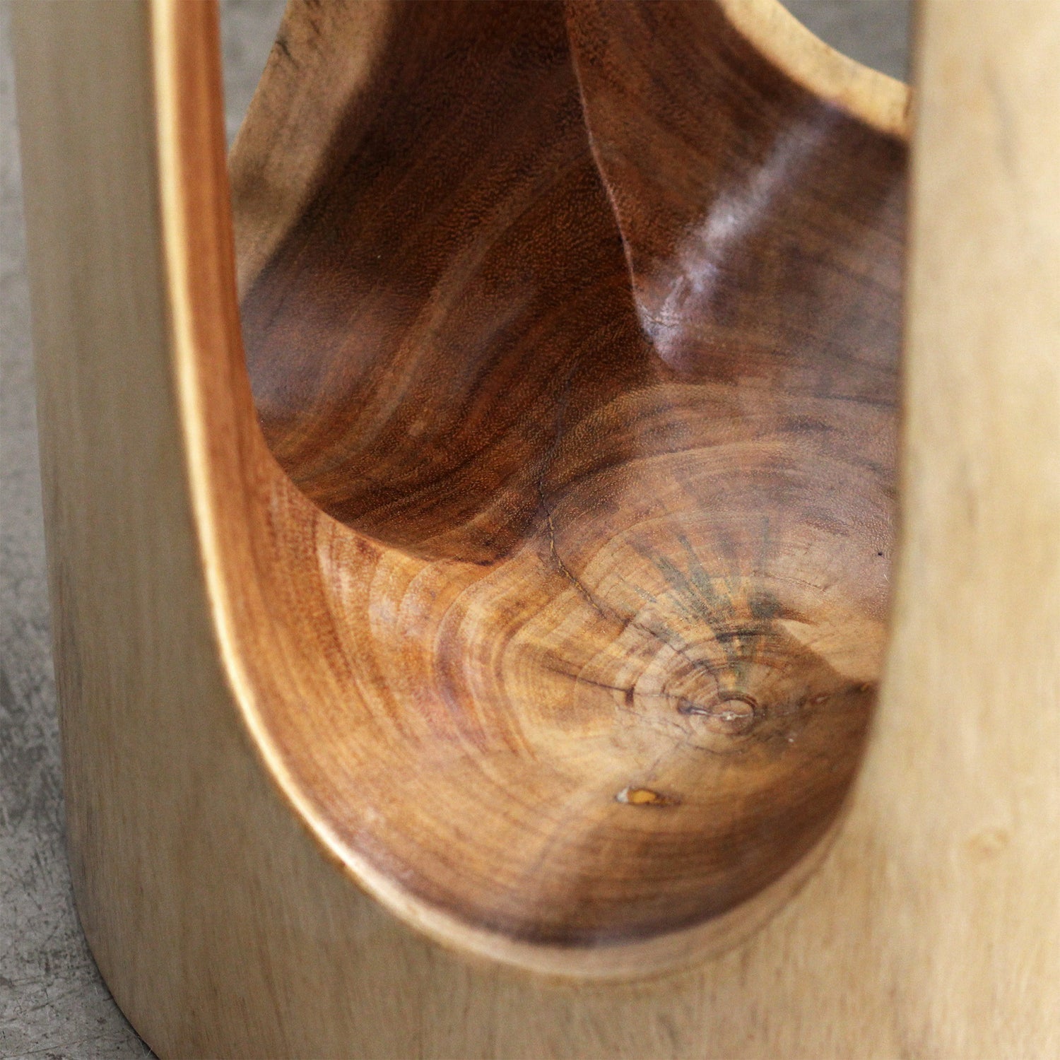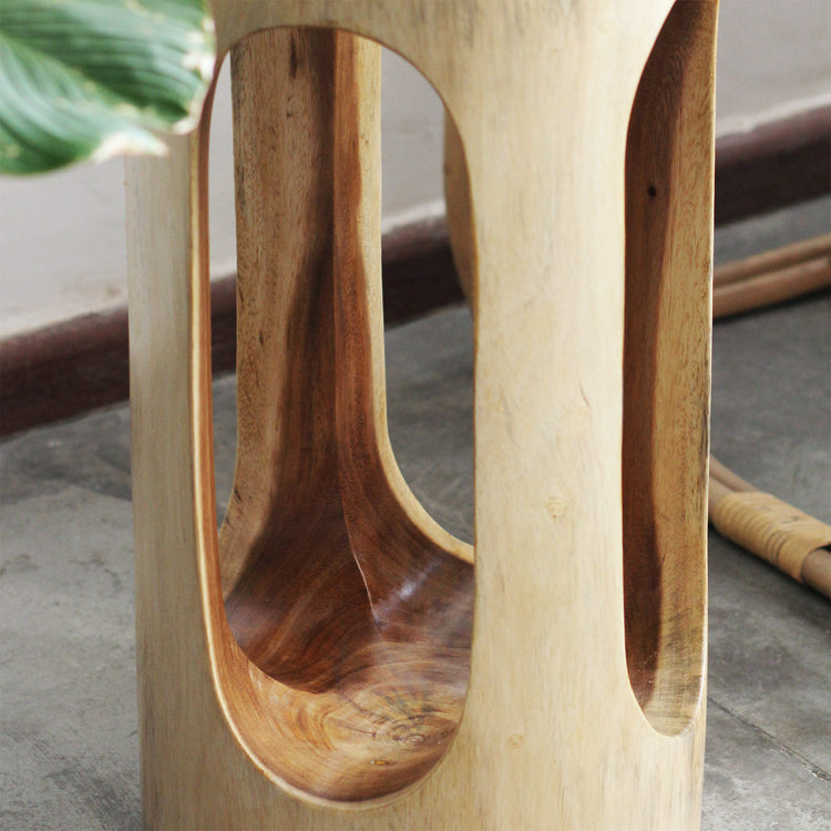 Feita à mão em Bali, na Indonésia, esta banqueta é esculpida a partir de uma única peça bruta de tamarindo maciço, destacando-se pelo design único com uma estrutura vazada no meio. Cada peça tem seu resultado visual natural, com variações de tonalidade únicas.