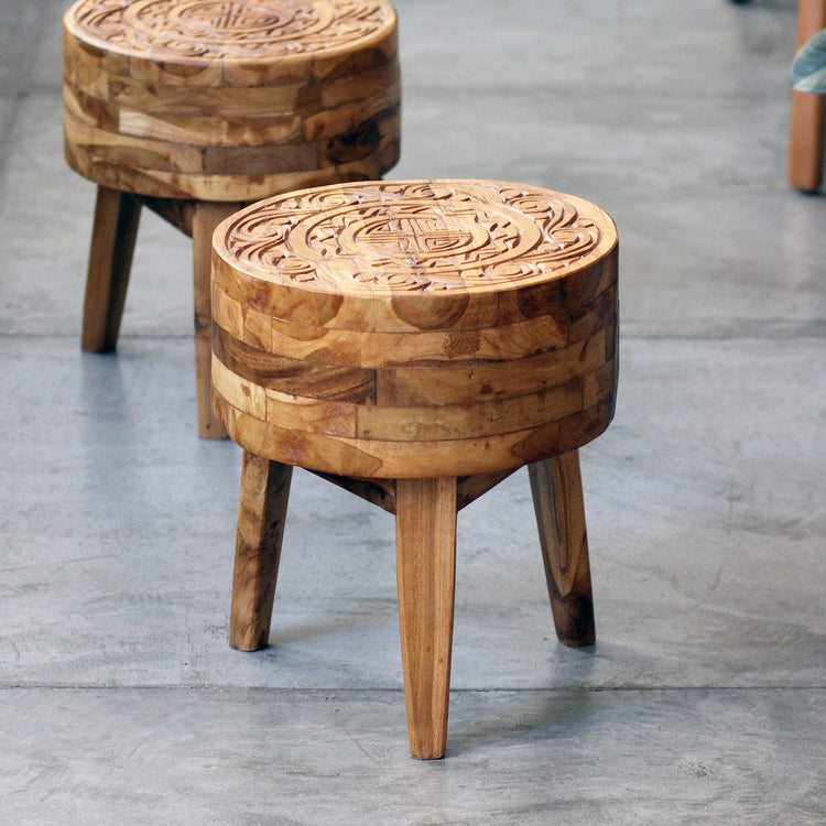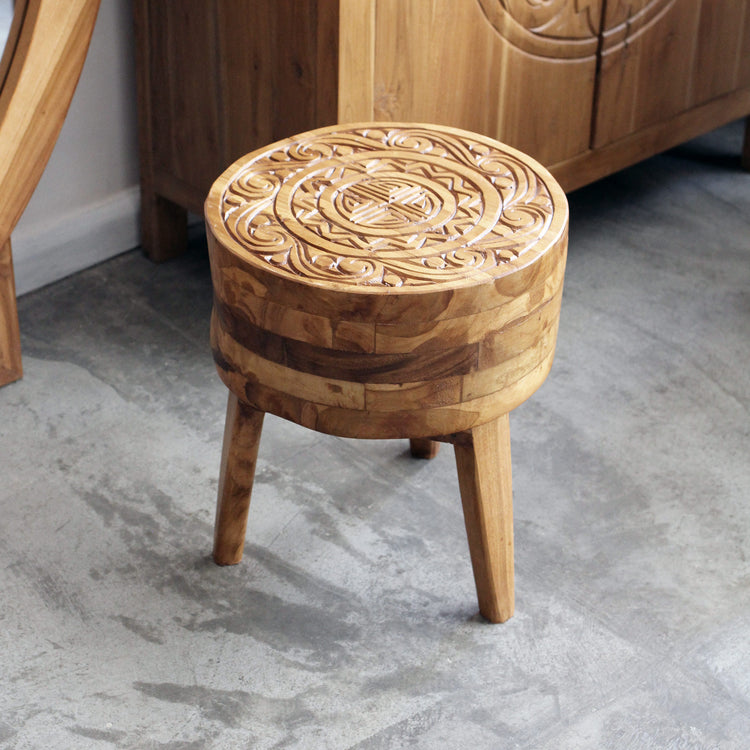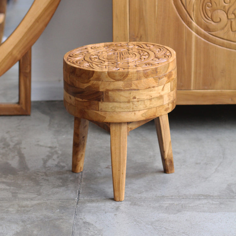 Banqueta Mesinha Maia é feita em madeira Teca leve e resistente com detalhes entalhados à mão.
