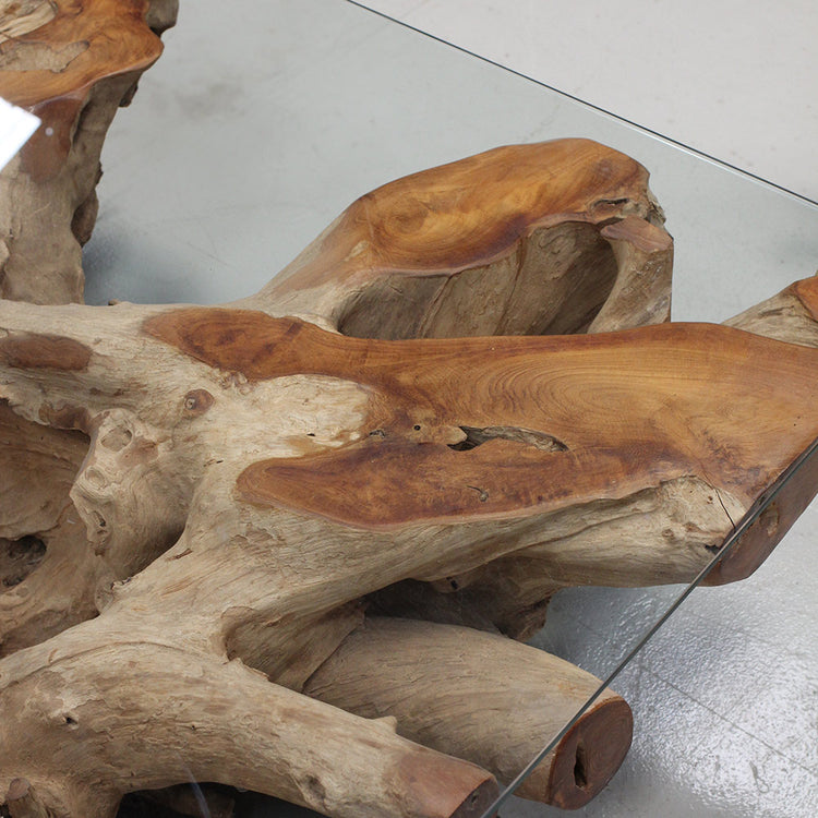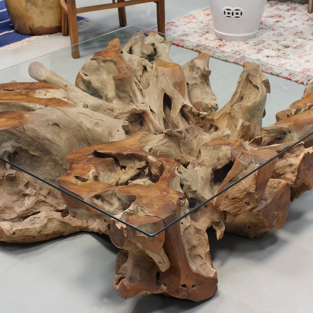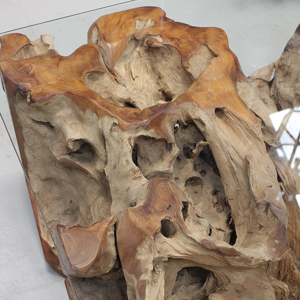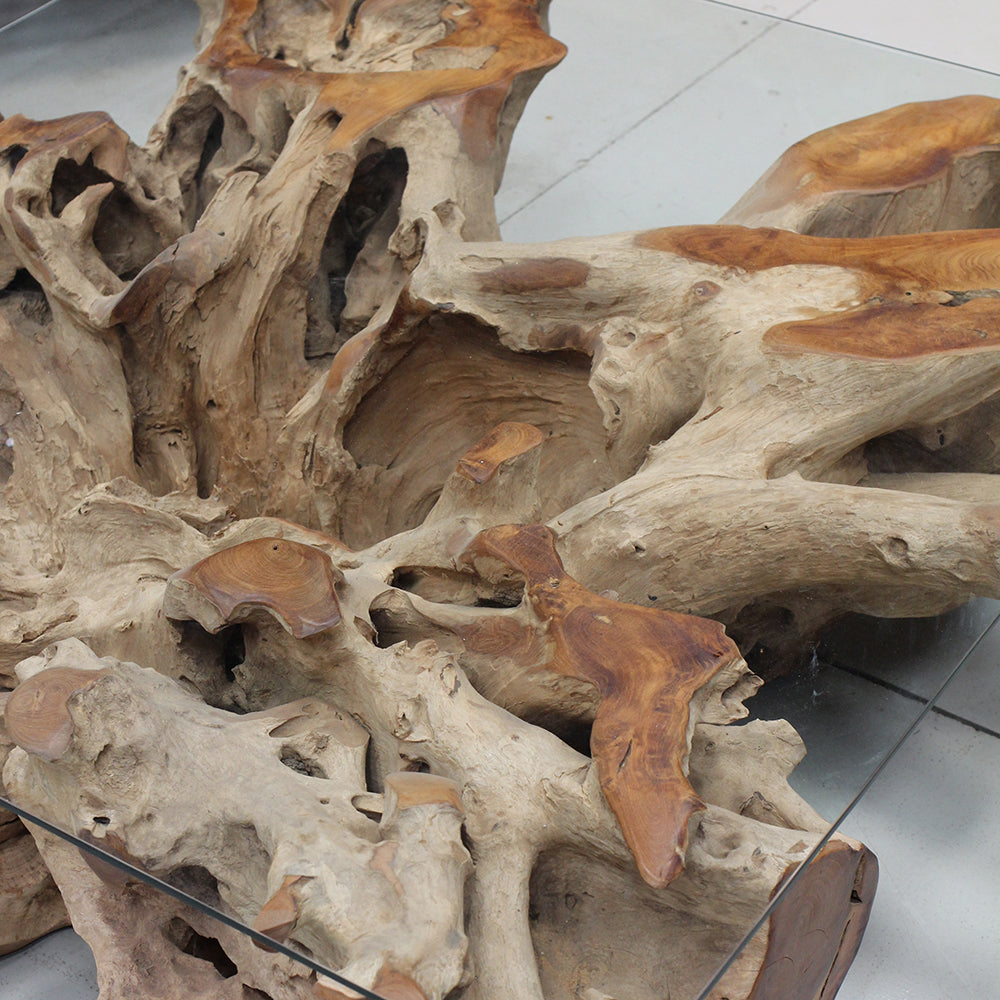 Produzida a partir da raiz de Teca reciclada, o artesão aproveita as curvas naturais da madeira e procura interferir o mínimo possível afim de conseguir um resultado orgânico e único, cada peça tem identidade própria.