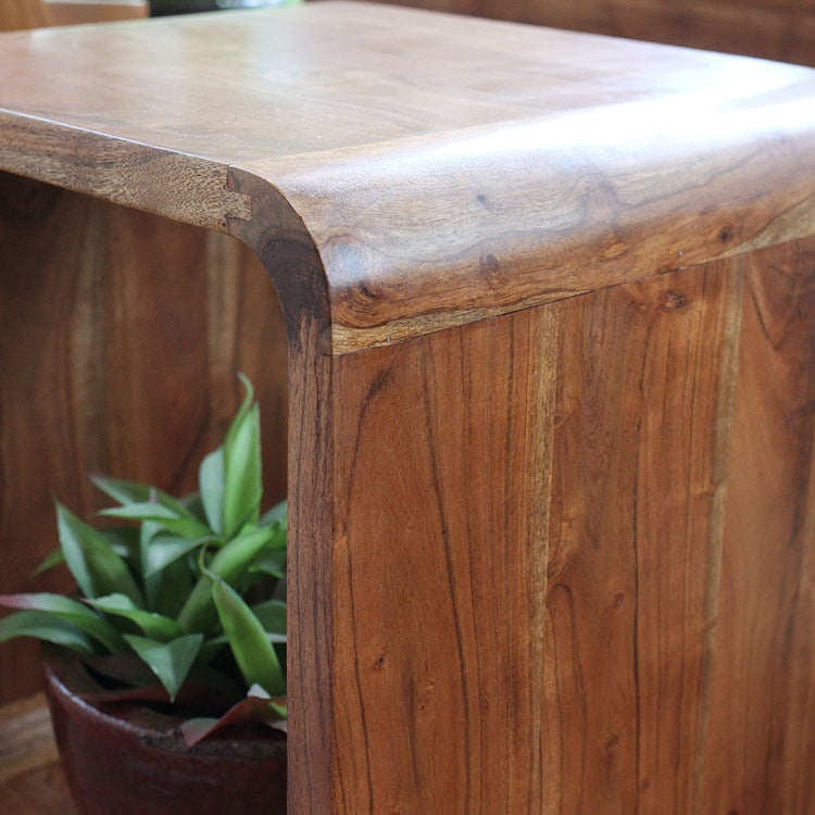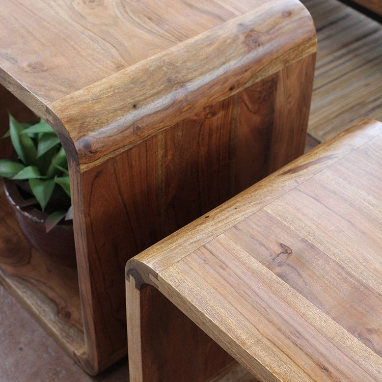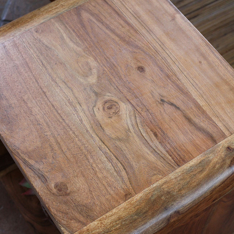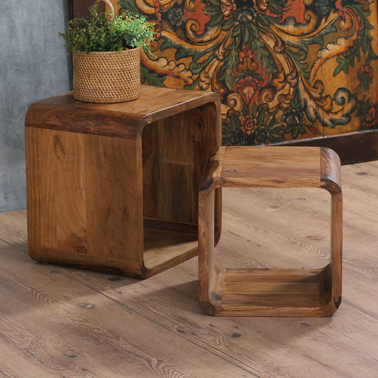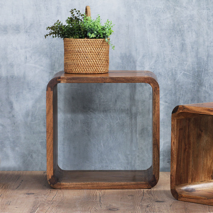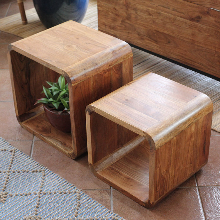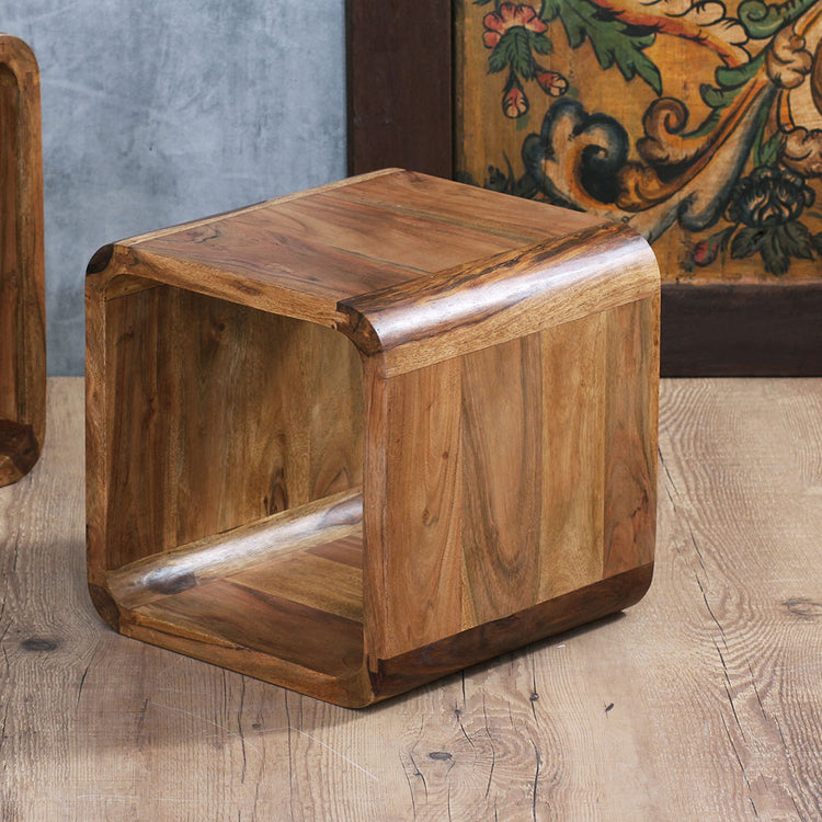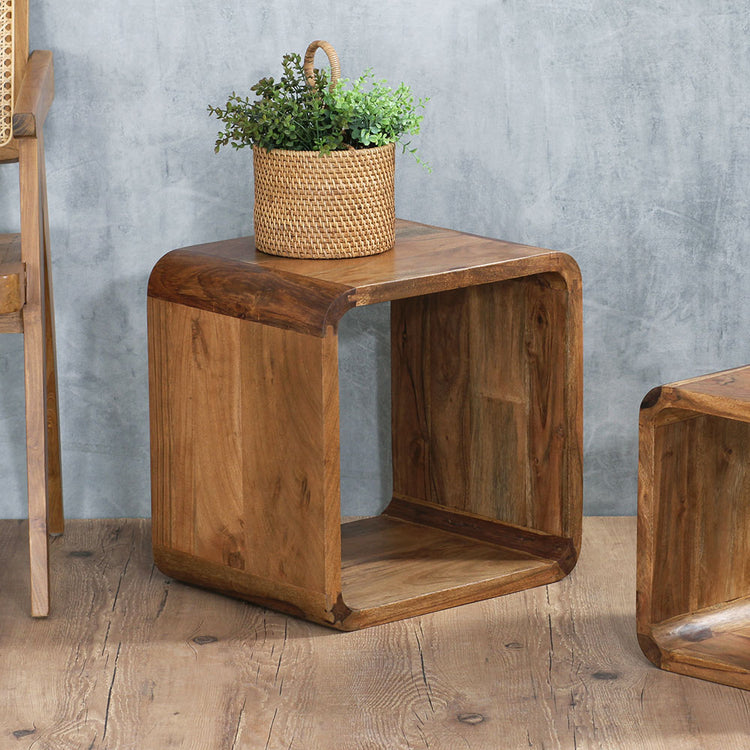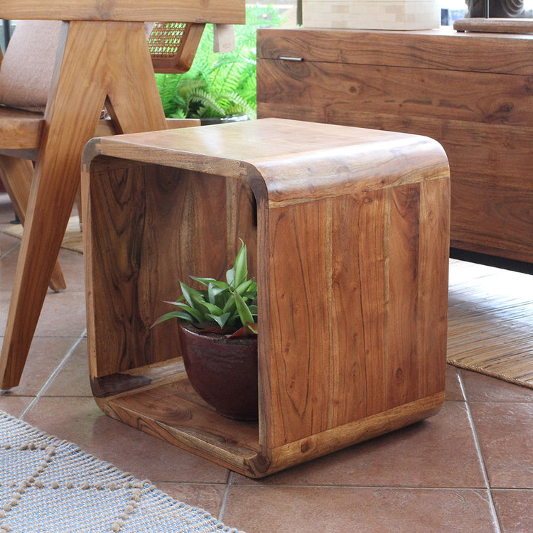 Fabricado em madeira acácia maciça, o cubo Ghan está disponível em dois tamanhos, vendidos separadamente.