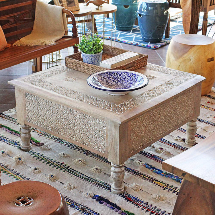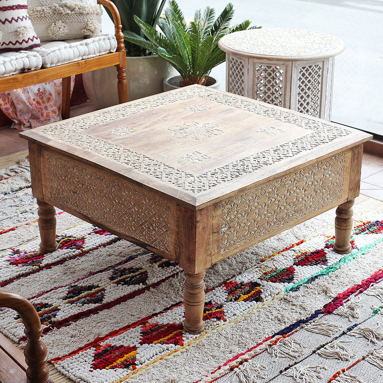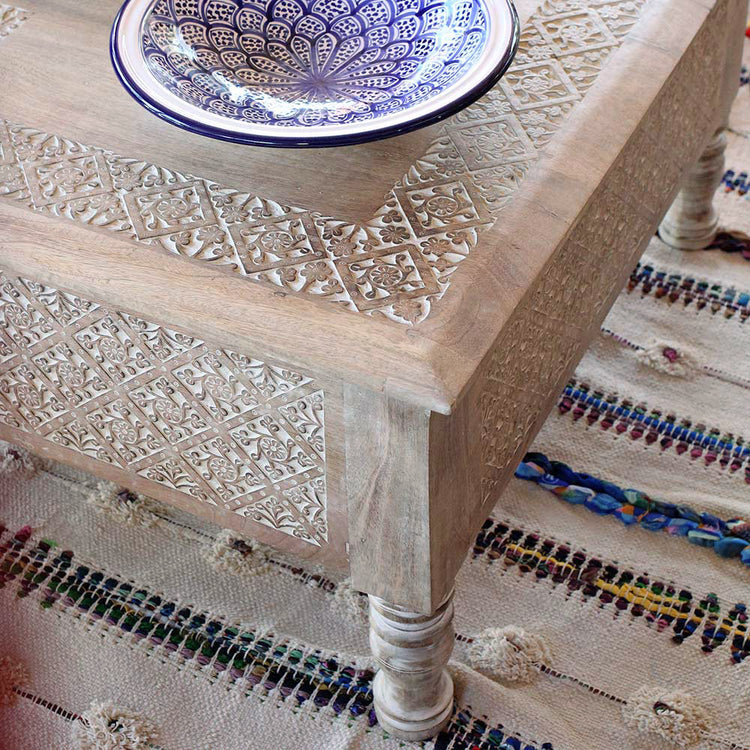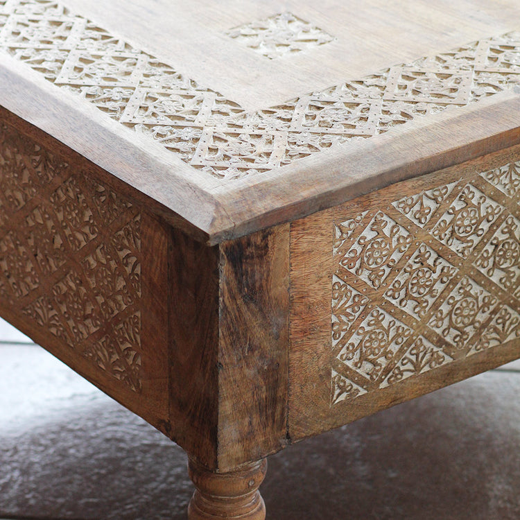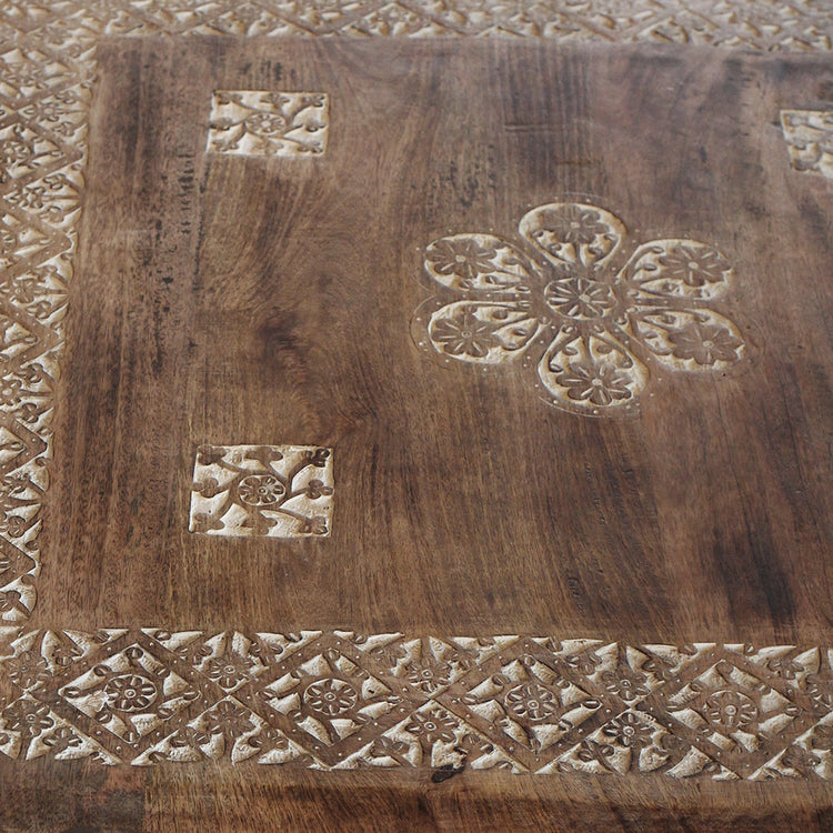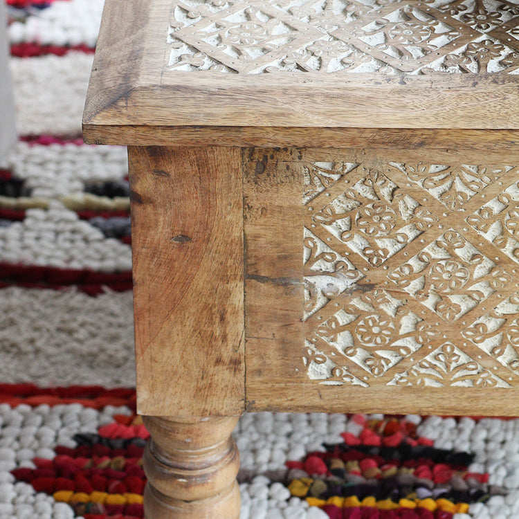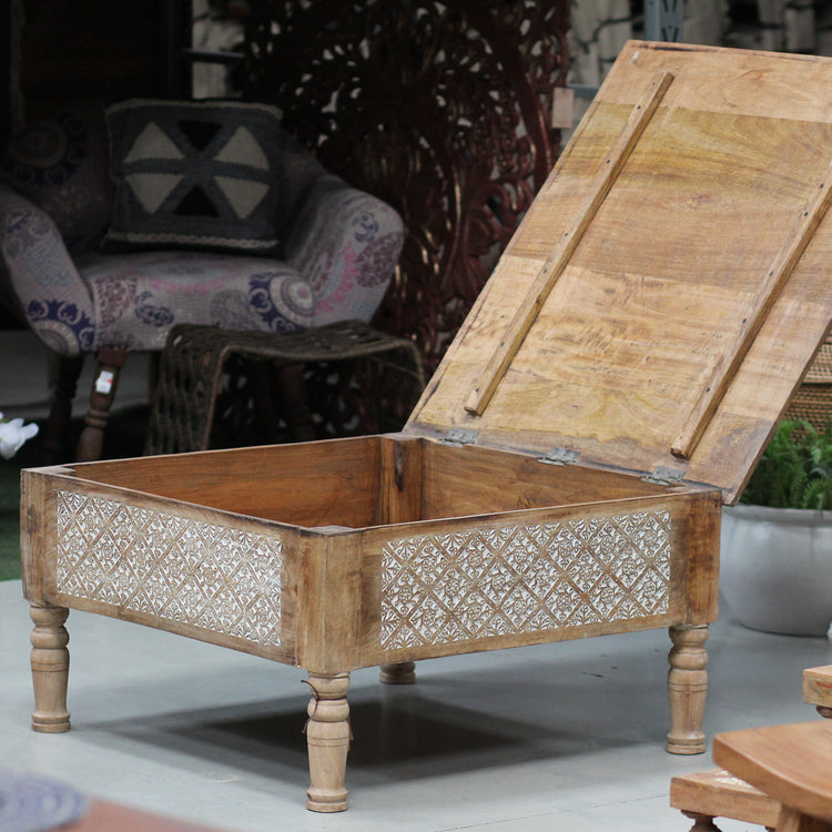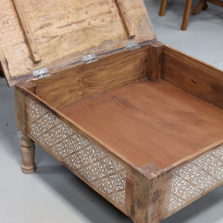 Mesa báu Pokarah com entalhes manuais tradicionais e tampo que pode ser aberto para guarda e organizar. Produzida em madeira mango maciça no norte Indiano.