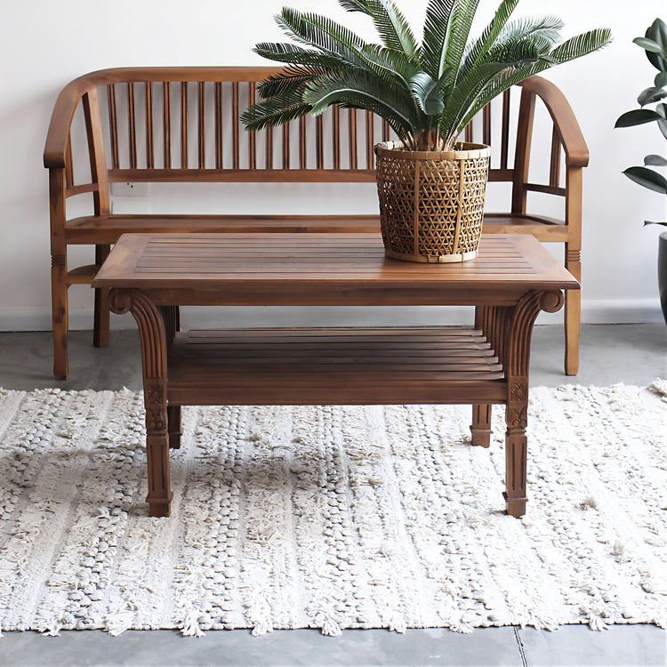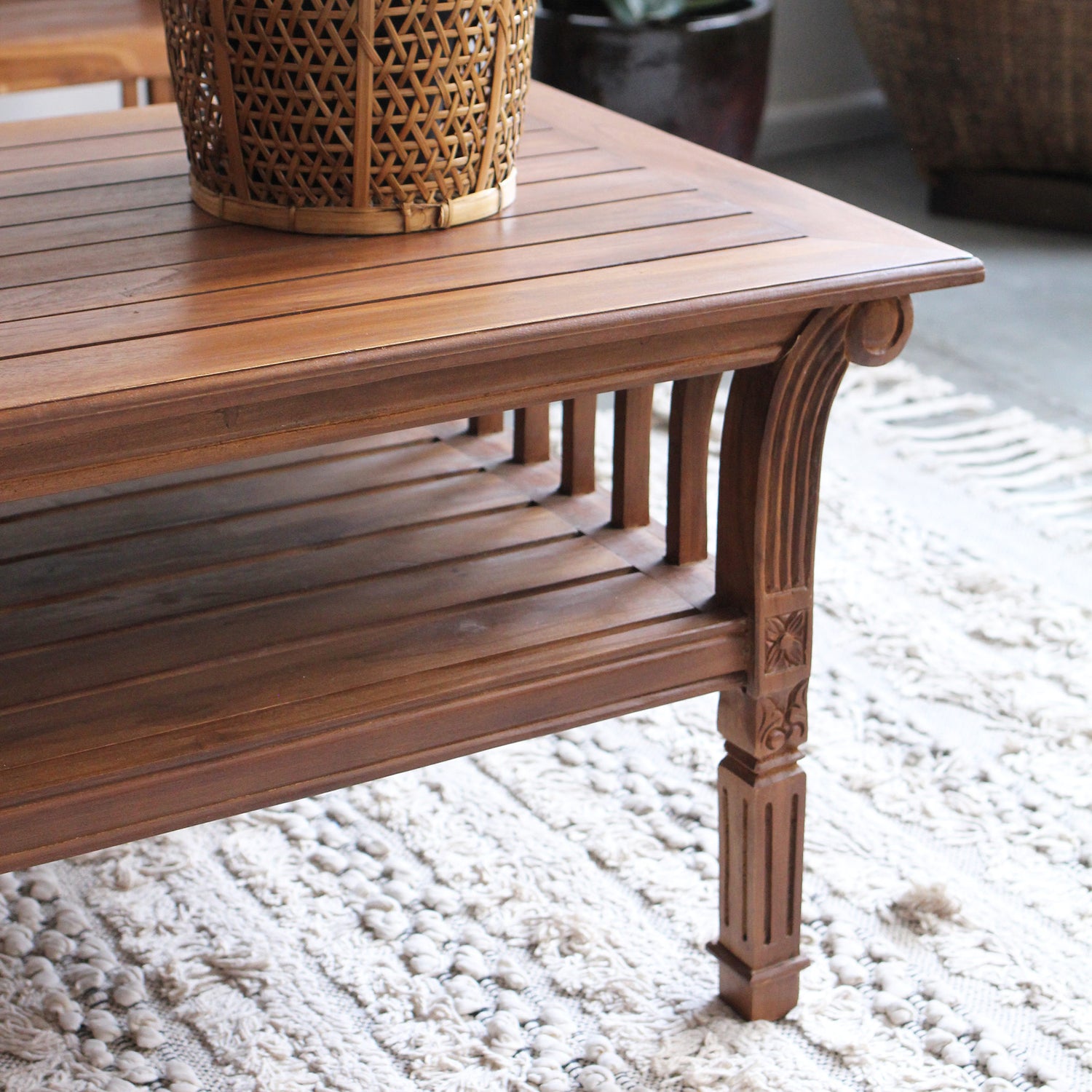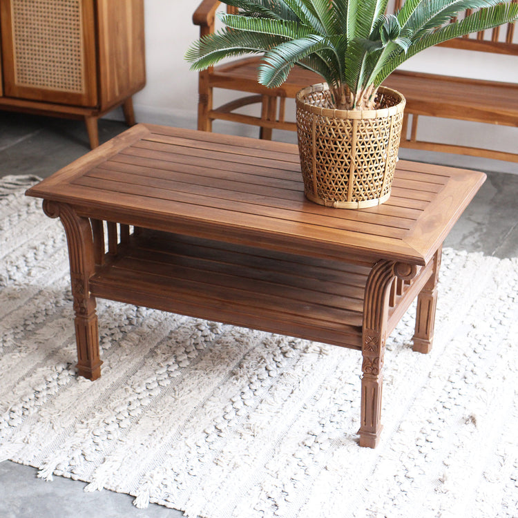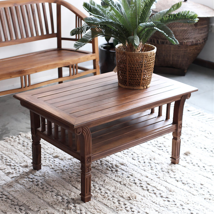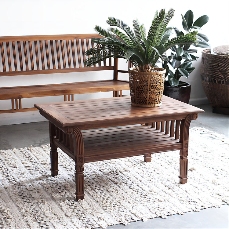 Um clássico da marcenaria Indonesiana, a Mesa de centro Laguna tem em seu desenho uma mistura de estilos, resultado da colonização Holandesa que influenciou artesãos locais a fabricarem móveis europeus tradicionais com uma “releitura” local no trabalho de “carvings” ou entalhes.