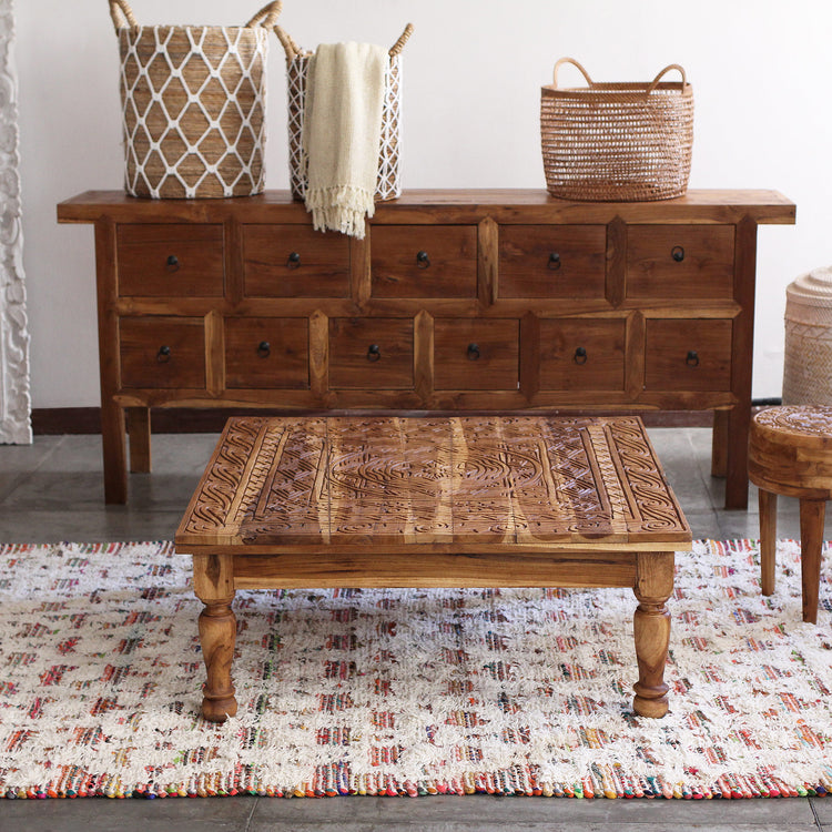Mesa de centro Yuda, feita em madeira teca maciça com detalhes talhados à mão.