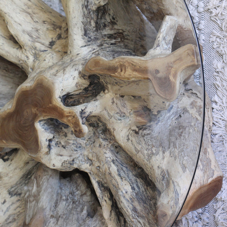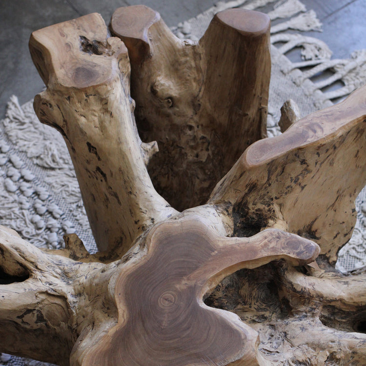 Produzida a partir da raiz de Teca reciclada, o artesão aproveita as curvas naturais da madeira e procura interferir o mínimo possível afim de conseguir um resultado orgânico e único, cada peça tem identidade própria.