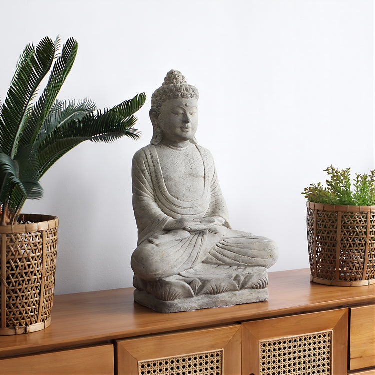 Escultura do Buda Dhyana Mudra com 60cm de altura, produzido em polystone, uma liga de resina com pedras, que remete ao aspecto e a textura de pedra vulcânica .
