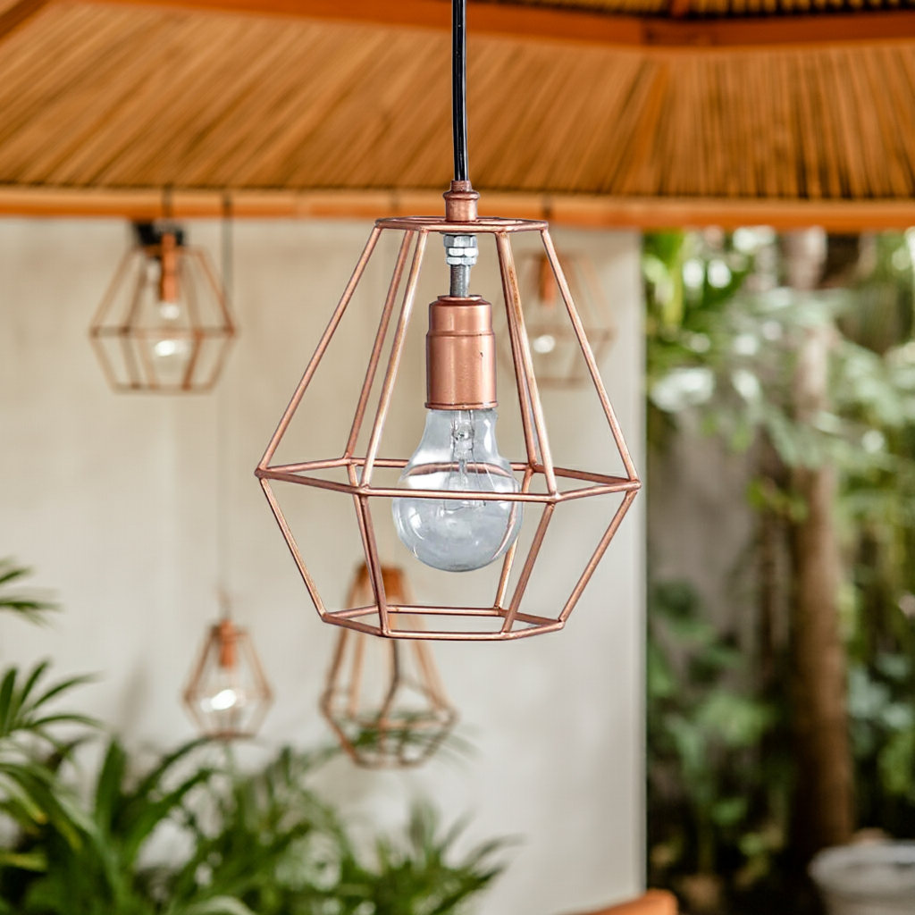 A Luminária Grid tem design industrial em ferro, com pintura cor de cobre que se encaixa bem em qualquer ambiente.