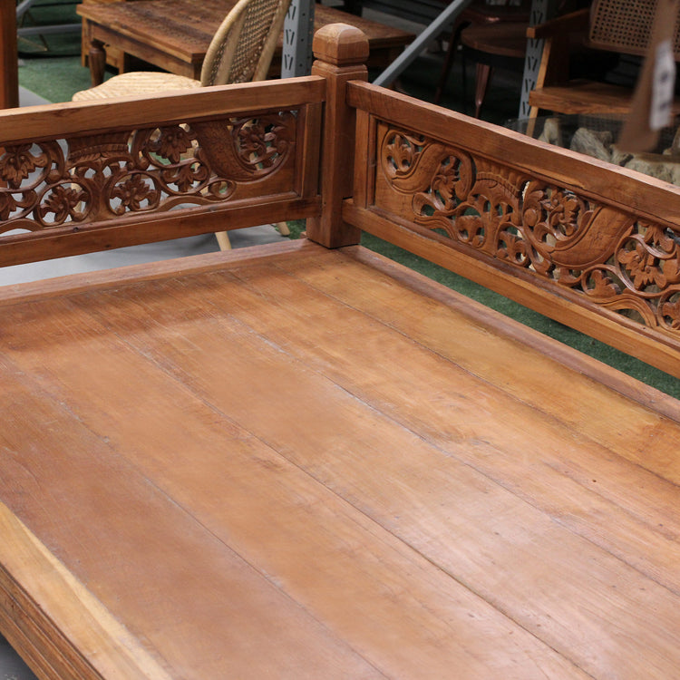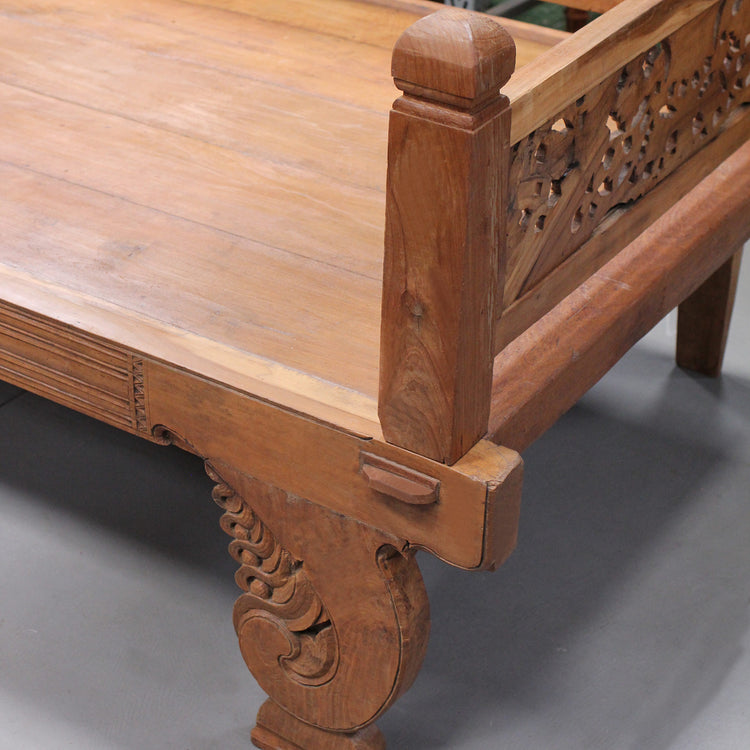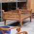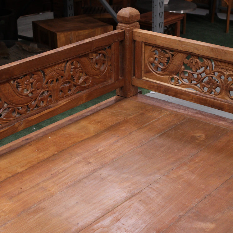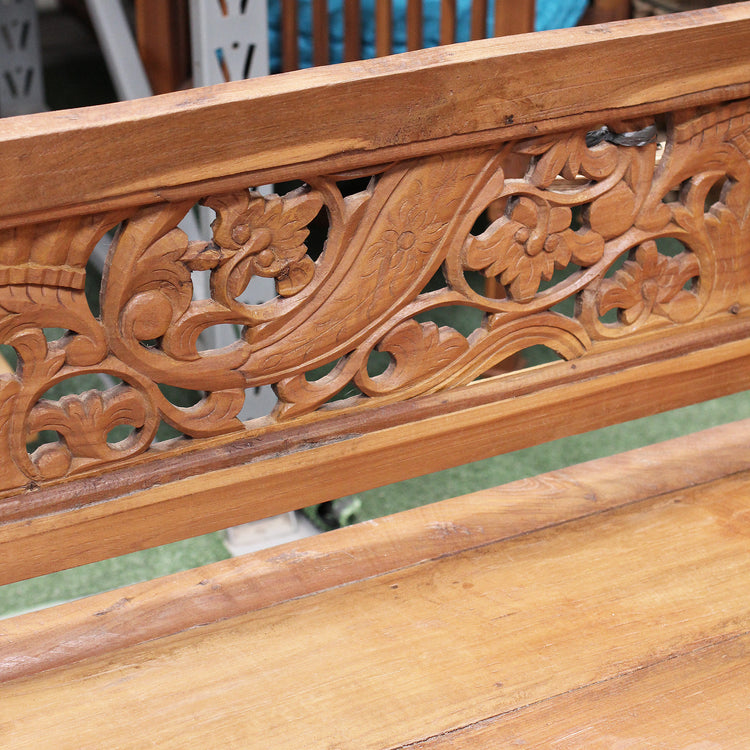 Com dimensões generosas, o Banco Luwih é feito em madeira teca com entalhes artesanais típicos da Indonésia