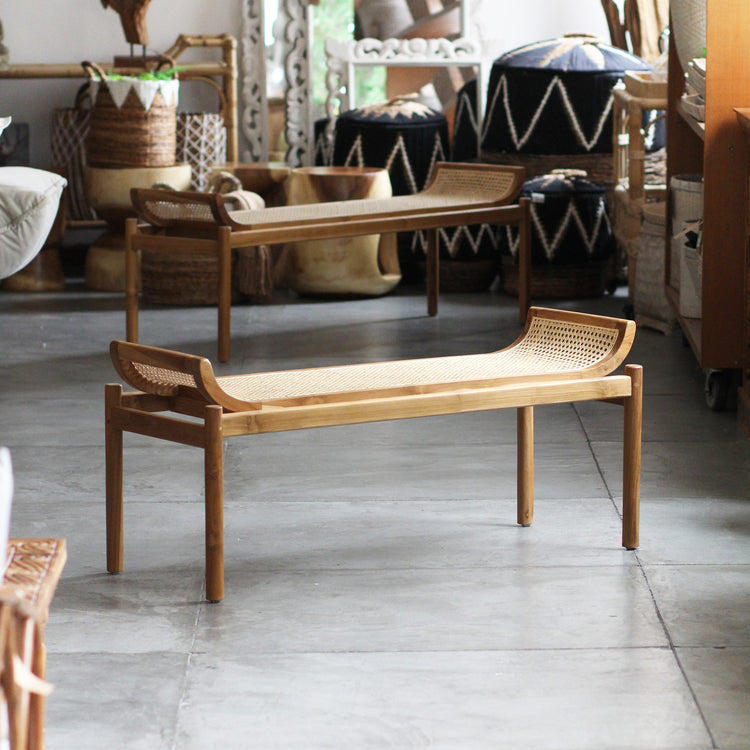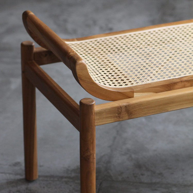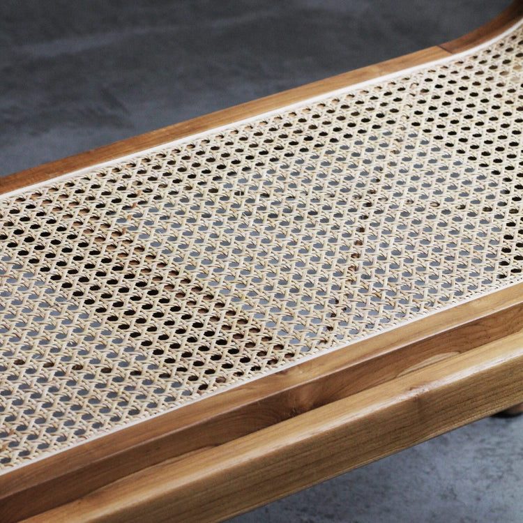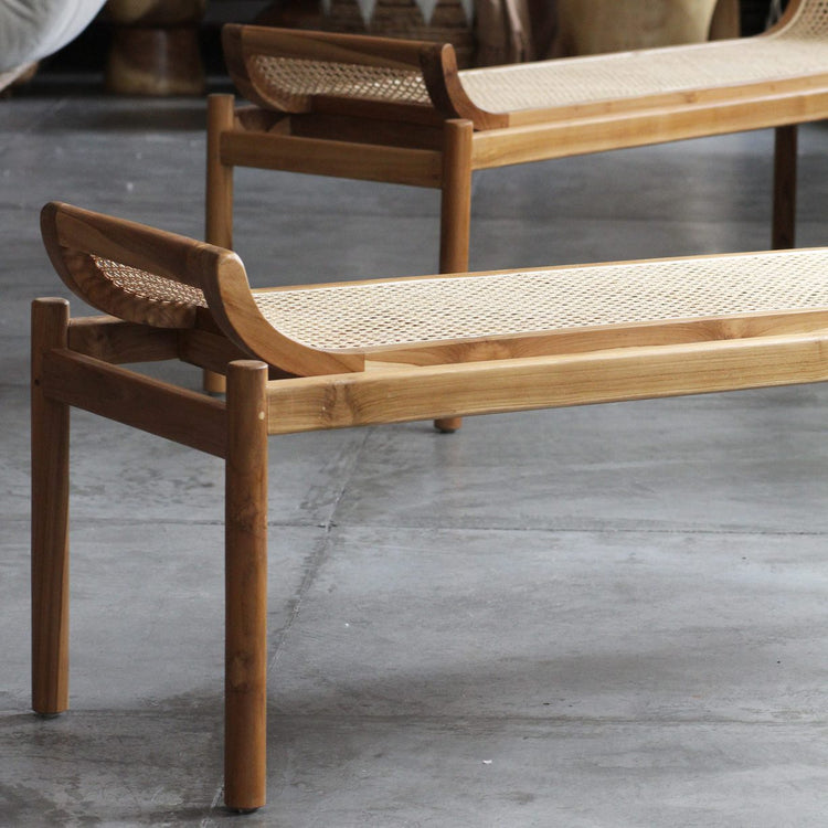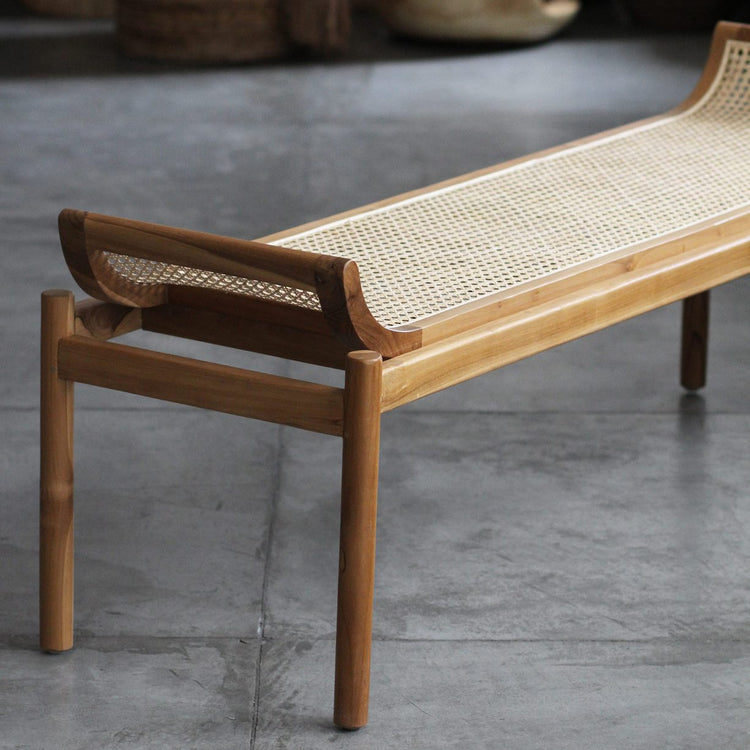 Com assento curvado em rattan e estrutura sólida em madeira teca, o Banco Soho 150CM e assento trançado em rattan.