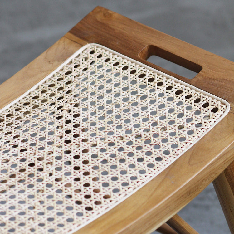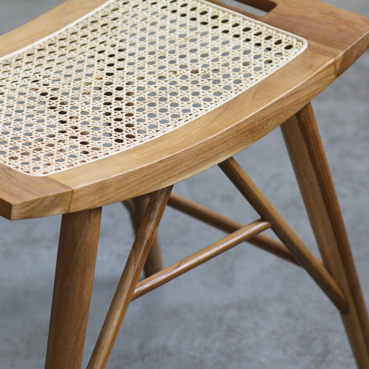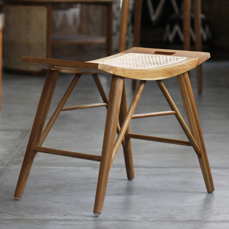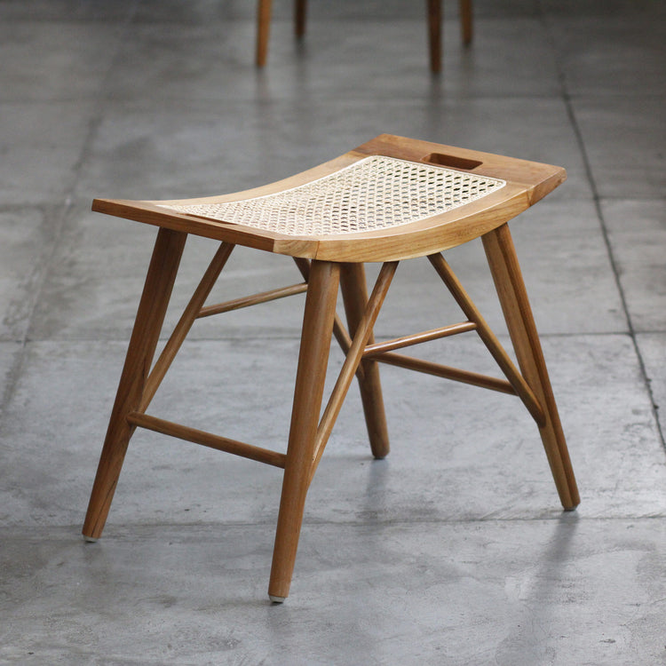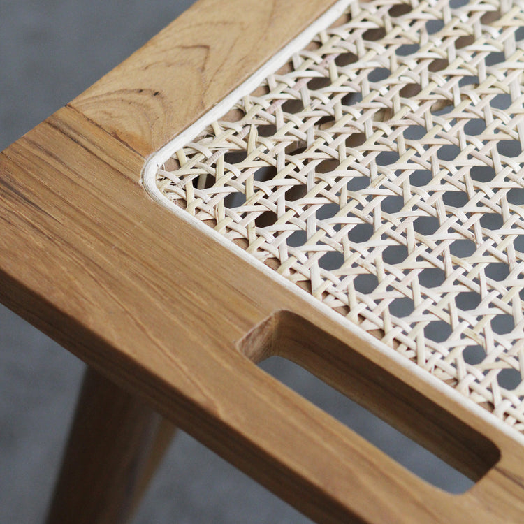 Com assento curvado em rattan e estrutura sólida em madeira teca, a Banqueta Soho tem pegadores nas pontas e é super versátil.