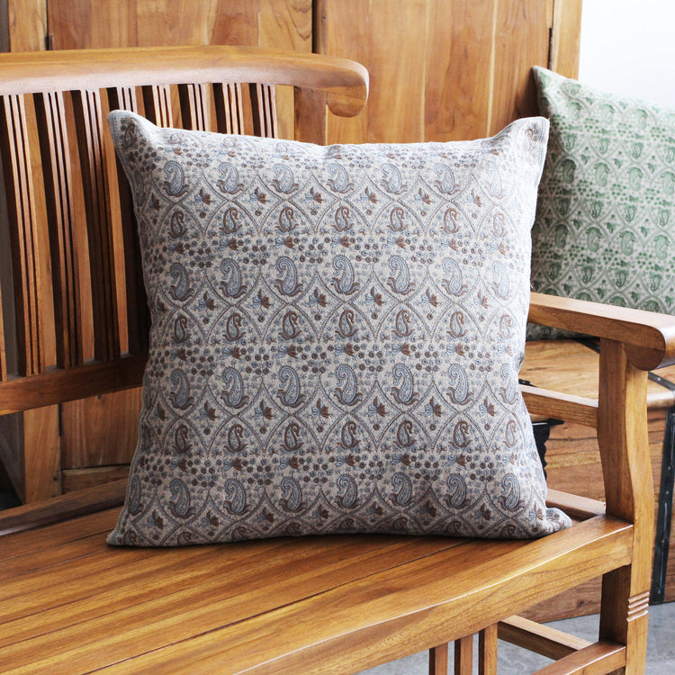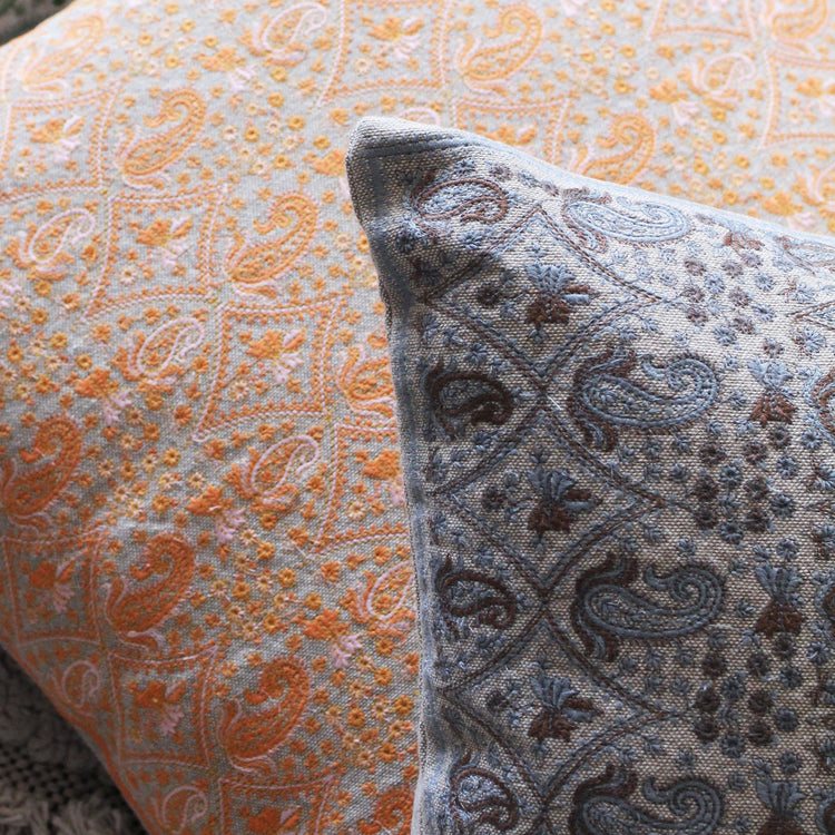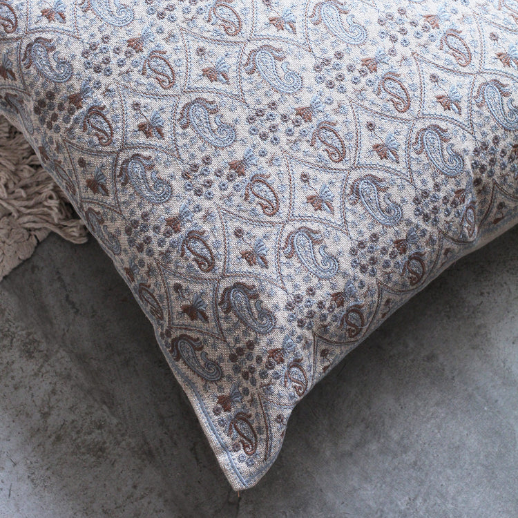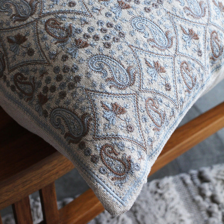 Feita no Rajastão em 100% algodão, a Capa de Almofada Daada apresenta bordados manuais delicados com padrões paisley em tons de azul e marrom sobre um fundo bege. Inspirada no artesanato tradicional da região, é uma peça versátil que traz um toque acolhedor ao ambiente.