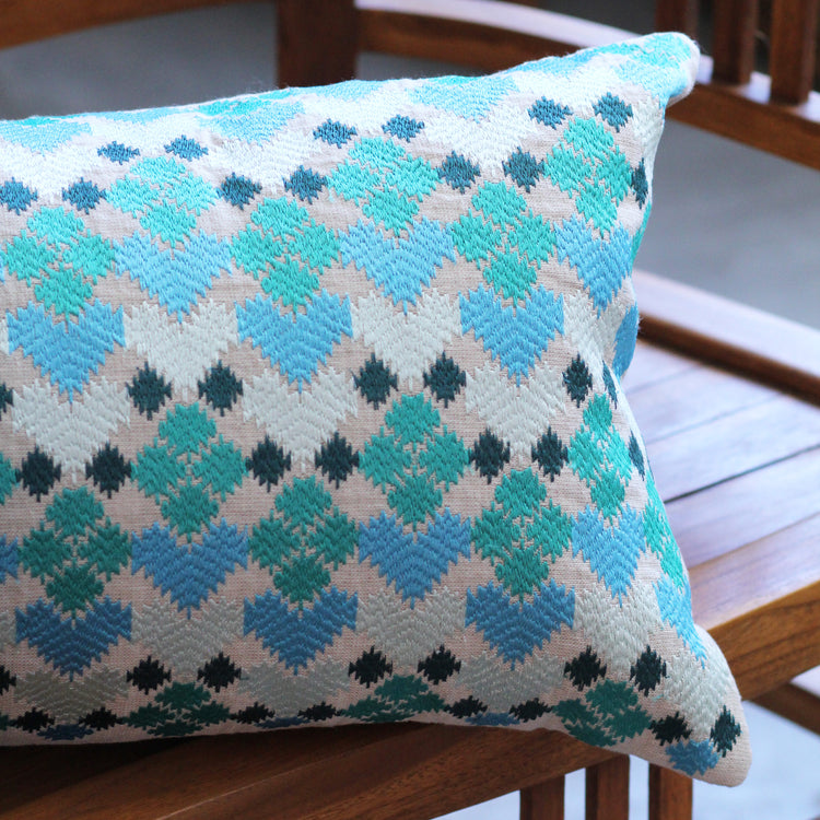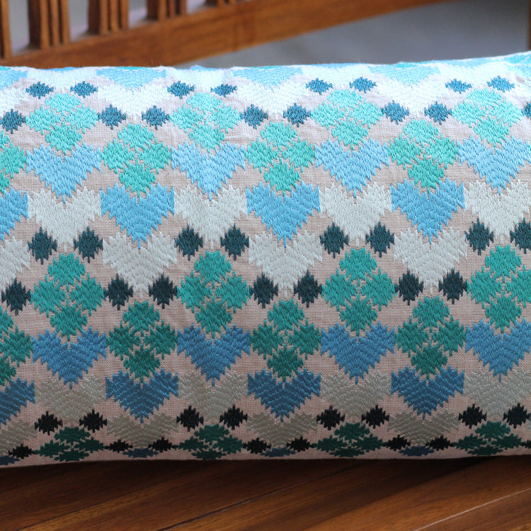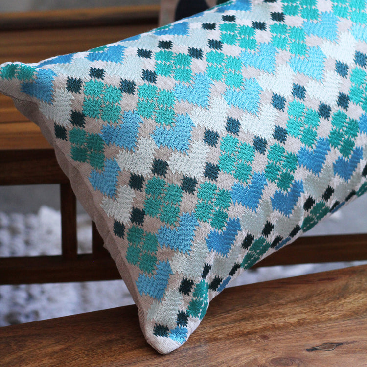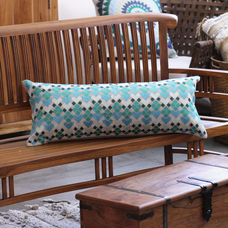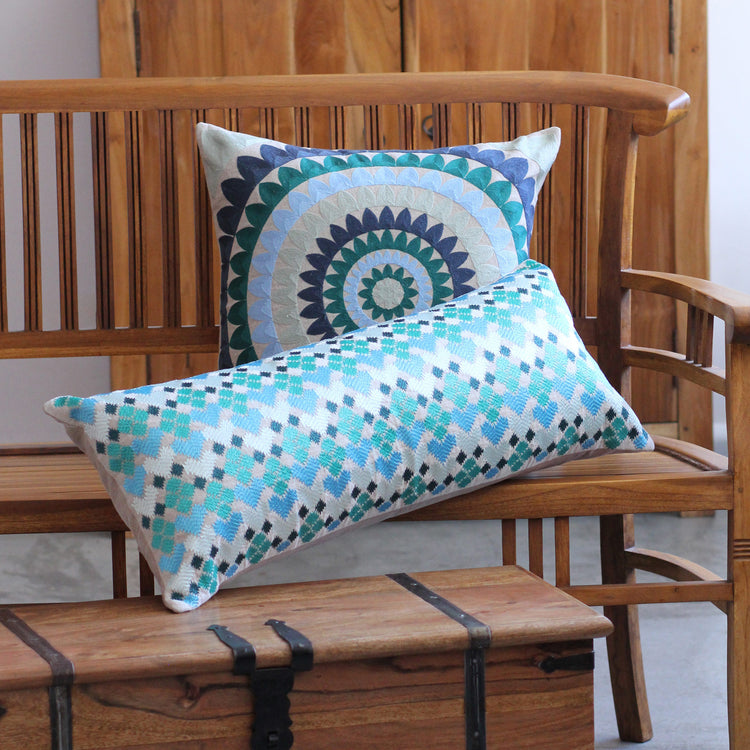 Produzida no Rajastão em 100% algodão, a Capa de Almofada Firoza destaca-se pelos bordados manuais com padrões geométricos em tons de azul. Inspirada no artesanato local, é uma peça versátil que traz frescor e harmonia para qualquer ambiente.