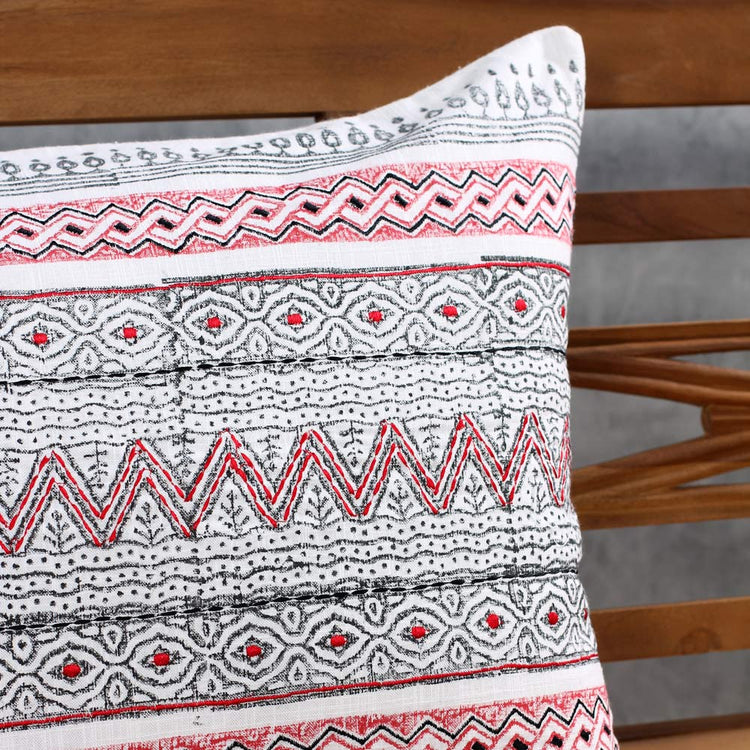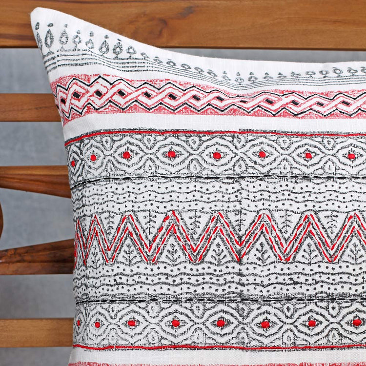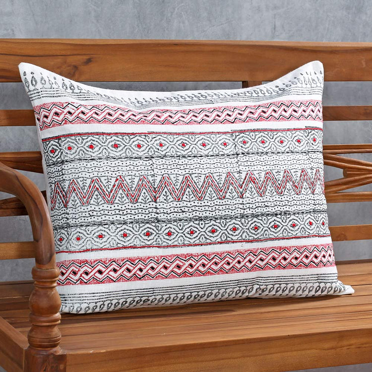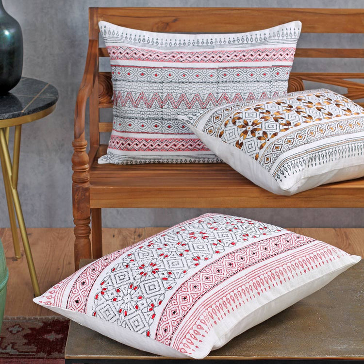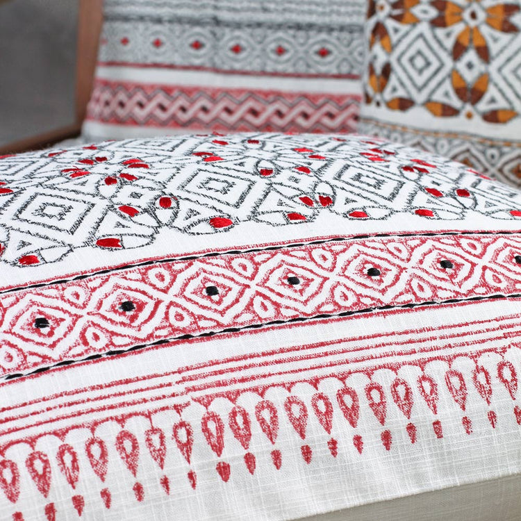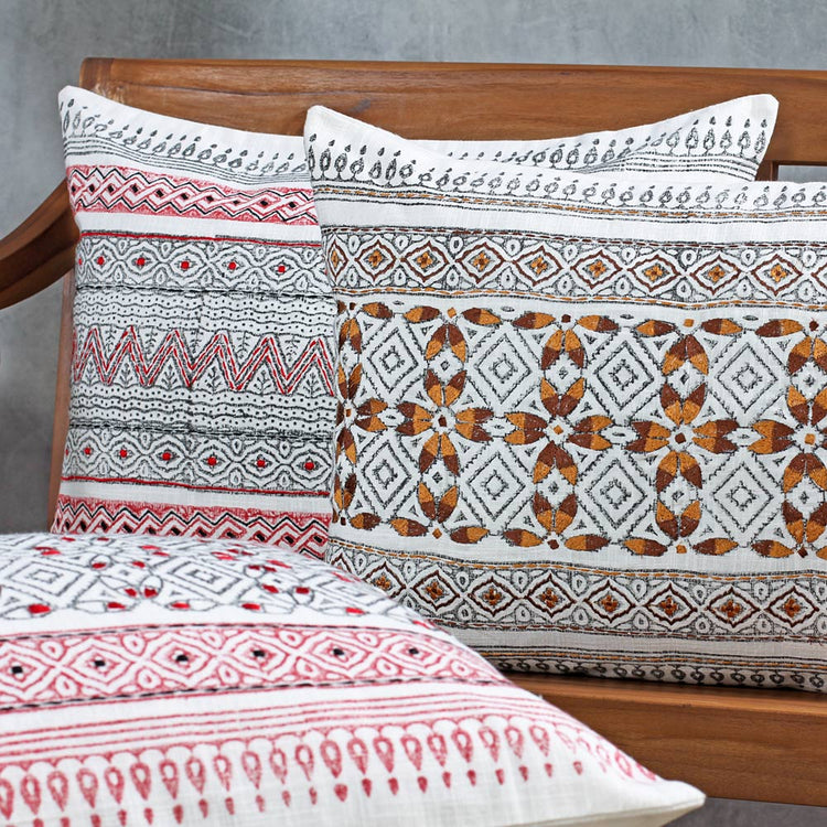 A almofada Florence tem motivos étnicos e processo de produção artesanal, sua arte é impressa utilizando a tradicional técnica de "block print"na qual o artesão imprime no tecido através de um carimbo de madeira, ela também conta com bordados pontuando a arte.