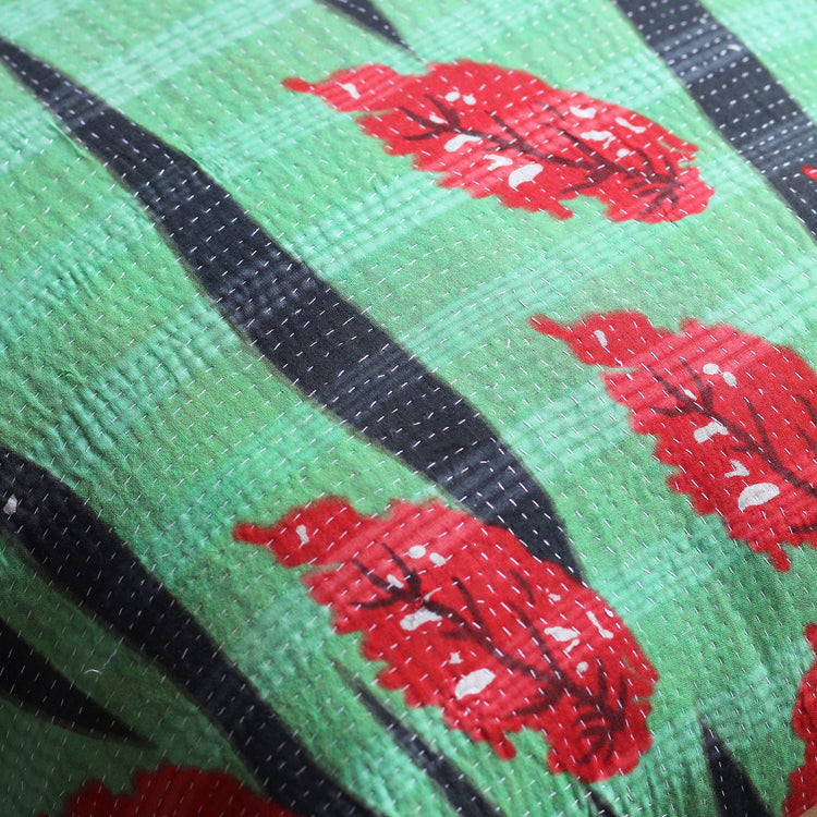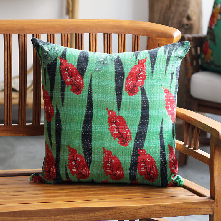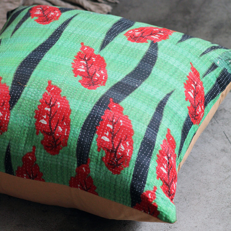 Capa de Almofada Hathi Leela traz cor e movimento com seu fundo verde, que contrasta lindamente com as folhas em vermelho, ela se destaca pela textura em pespontos que percorrem toda a superfície criadas com a técnica de bordado kantha.