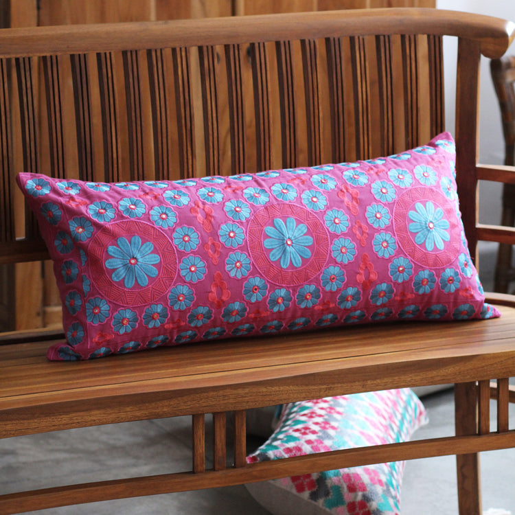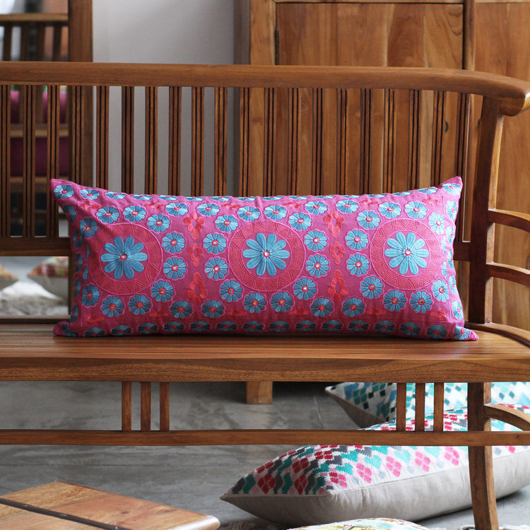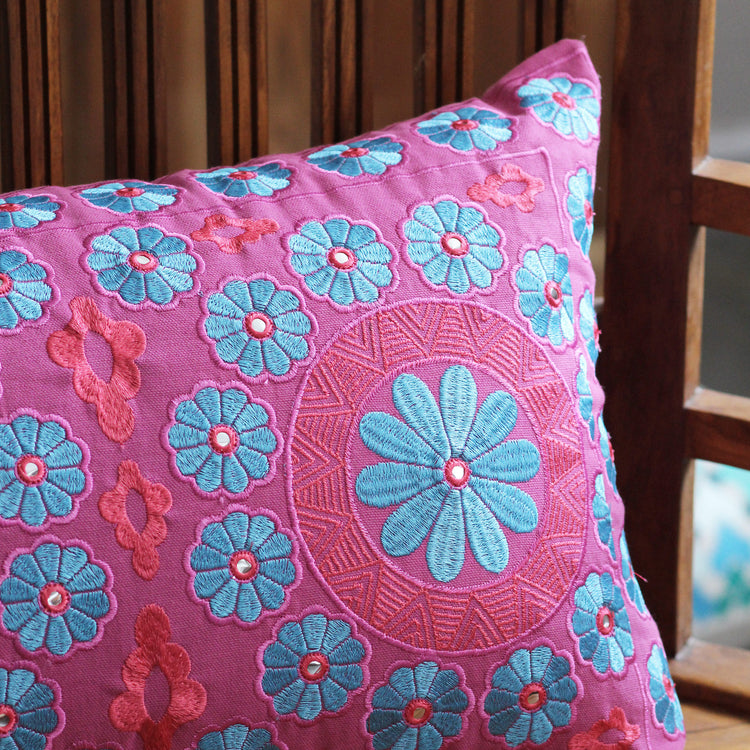 Produzida no Rajastão em 100% algodão, a Capa de Almofada Jeevit apresenta bordados manuais com padrões florais em tons de azul e rosa sobre um fundo vibrante. Inspirada na tradição artesanal da região, ela combina beleza e cultura, trazendo vida e cor ao ambiente.