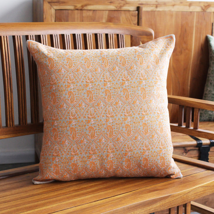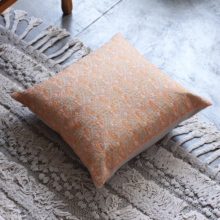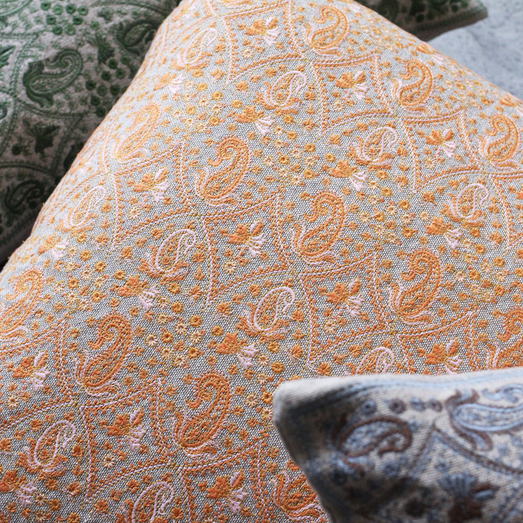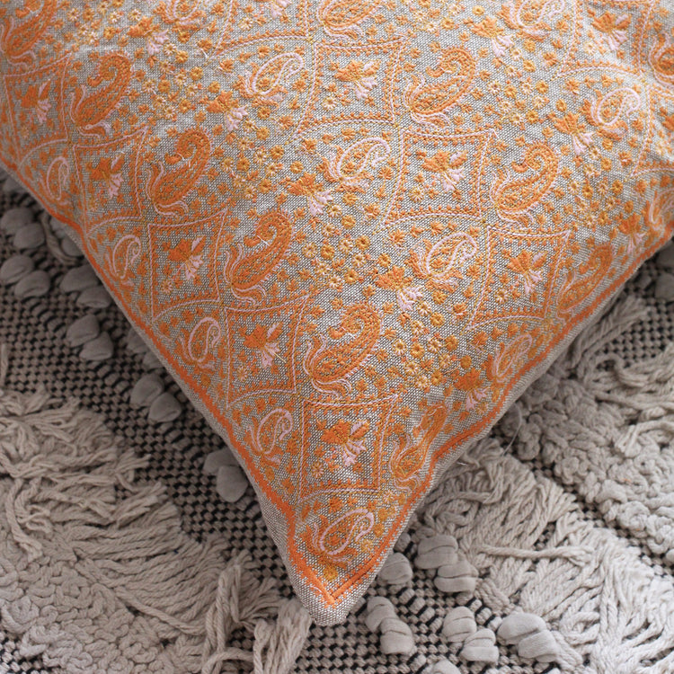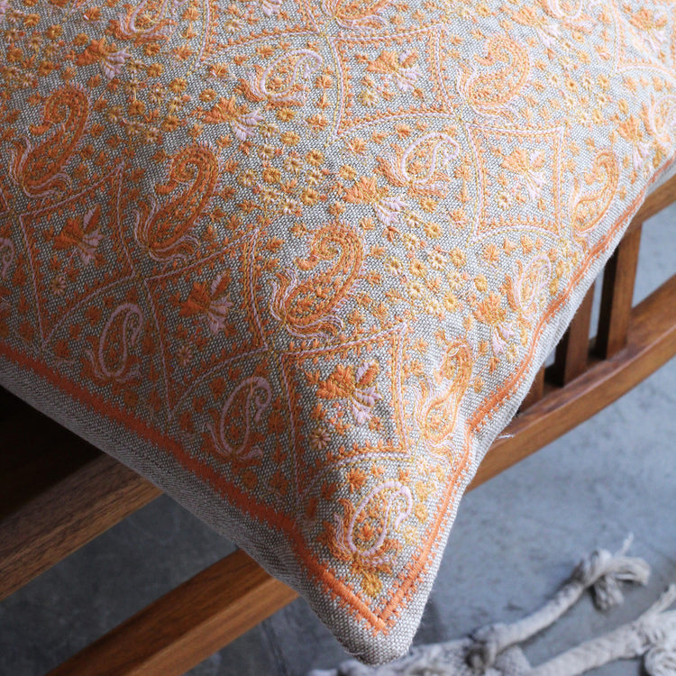 Produzida no Rajastão em 100% algodão, a Capa de Almofada Khet apresenta bordados manuais refinados com padrões paisley em tons de laranja queimado sobre um fundo bege. Inspirada na tradição artesanal da região, ela traz um toque vibrante e elegante para a composição.