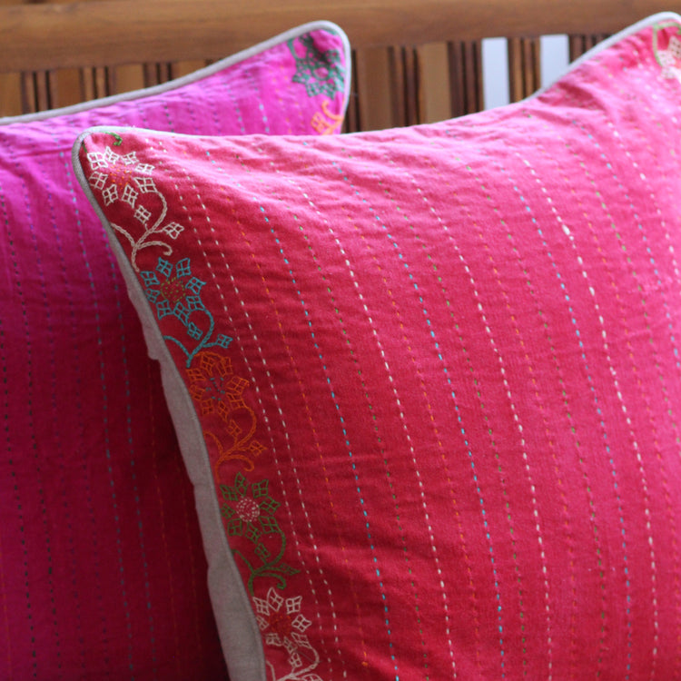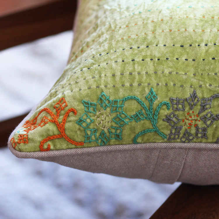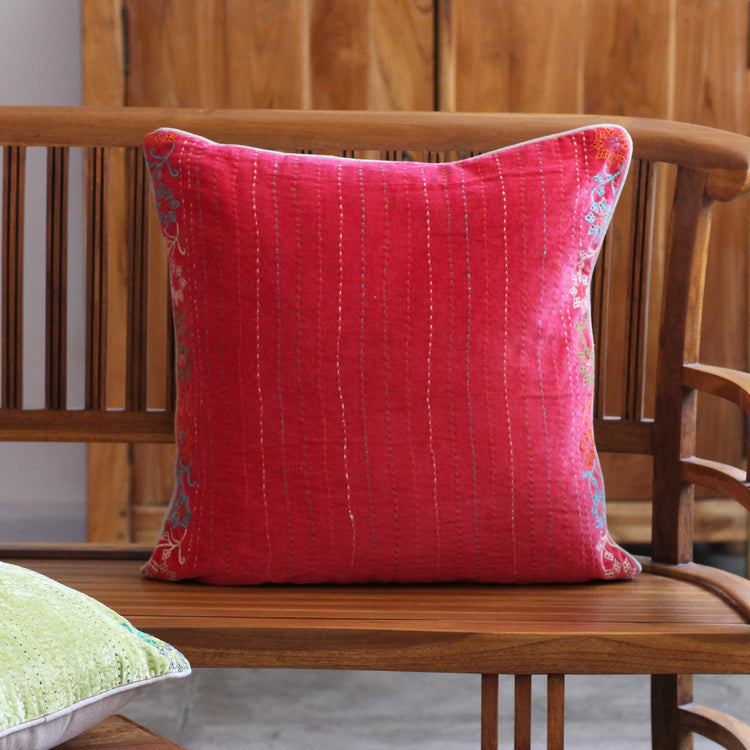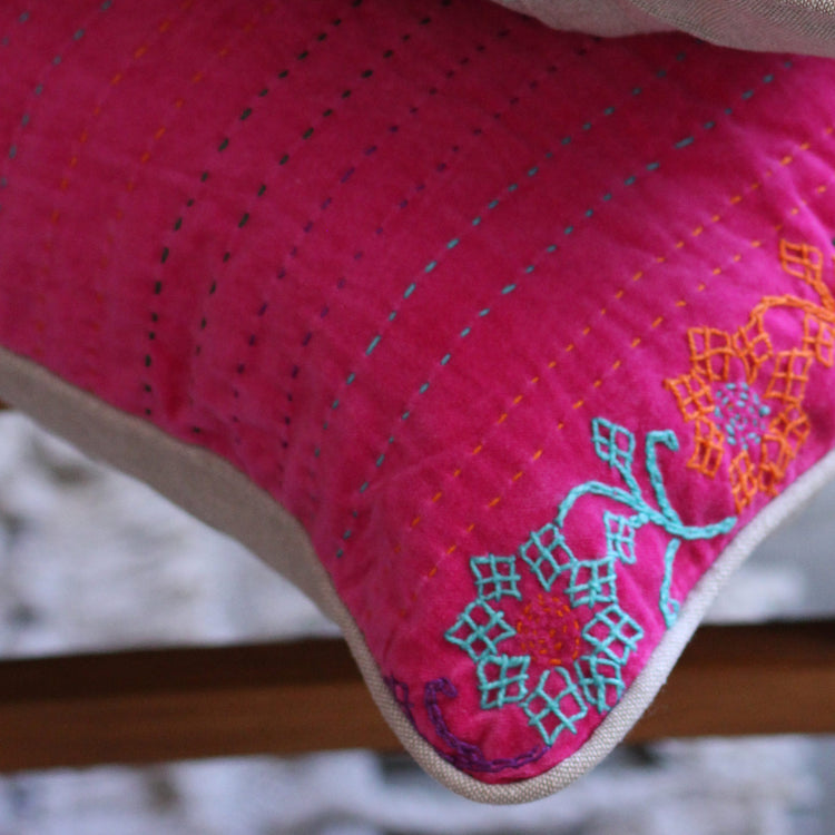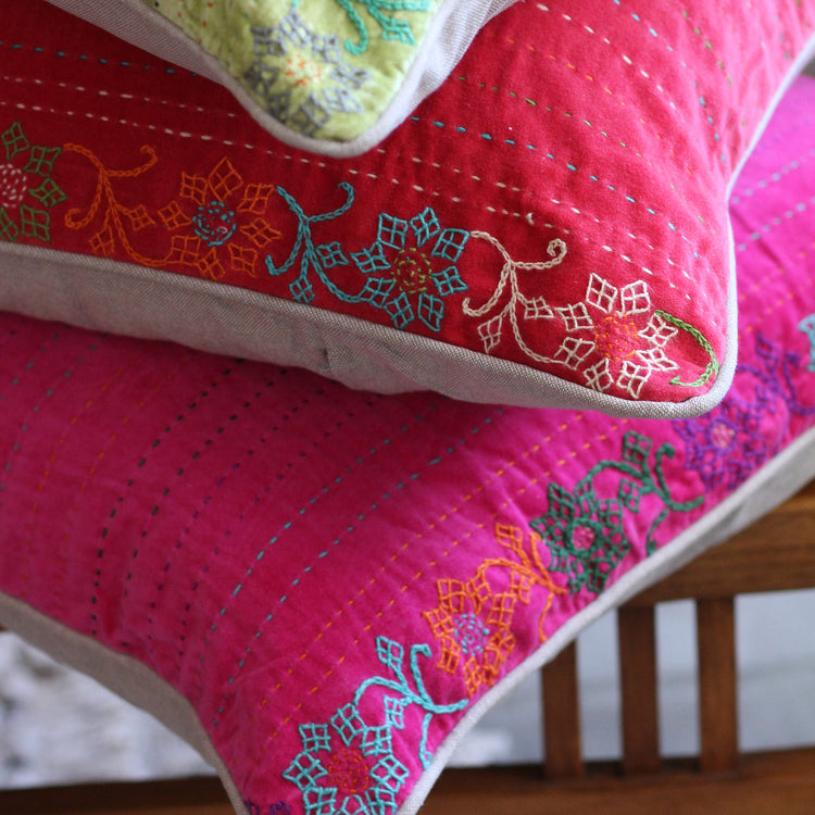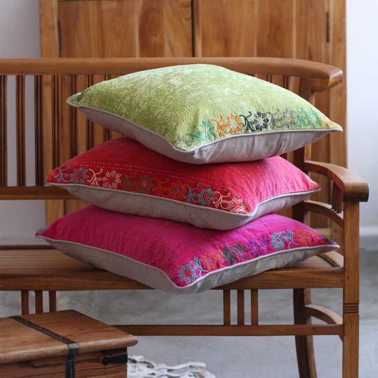 Feita no Rajastão em 100% algodão, a Capa de Almofada Makha apresenta bordados manuais sutis com linhas delicadas sobre um fundo vibrante que traz cor e charme ao ambiente. Inspirada no artesanato tradicional da região.