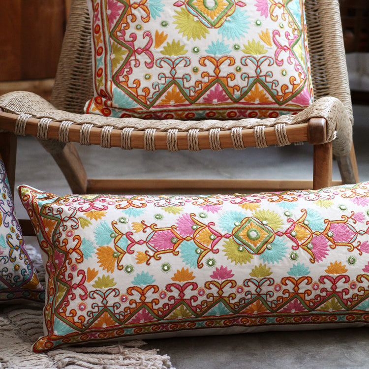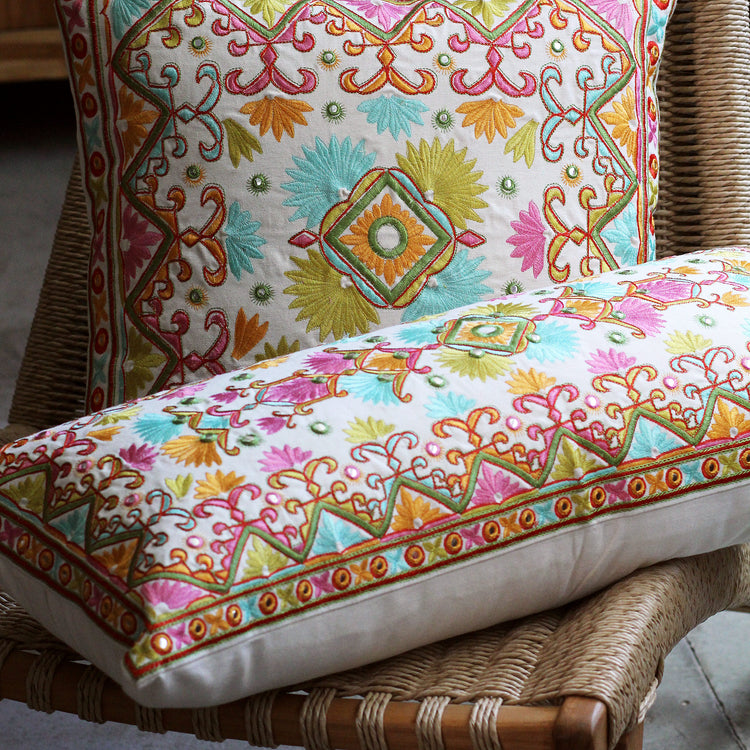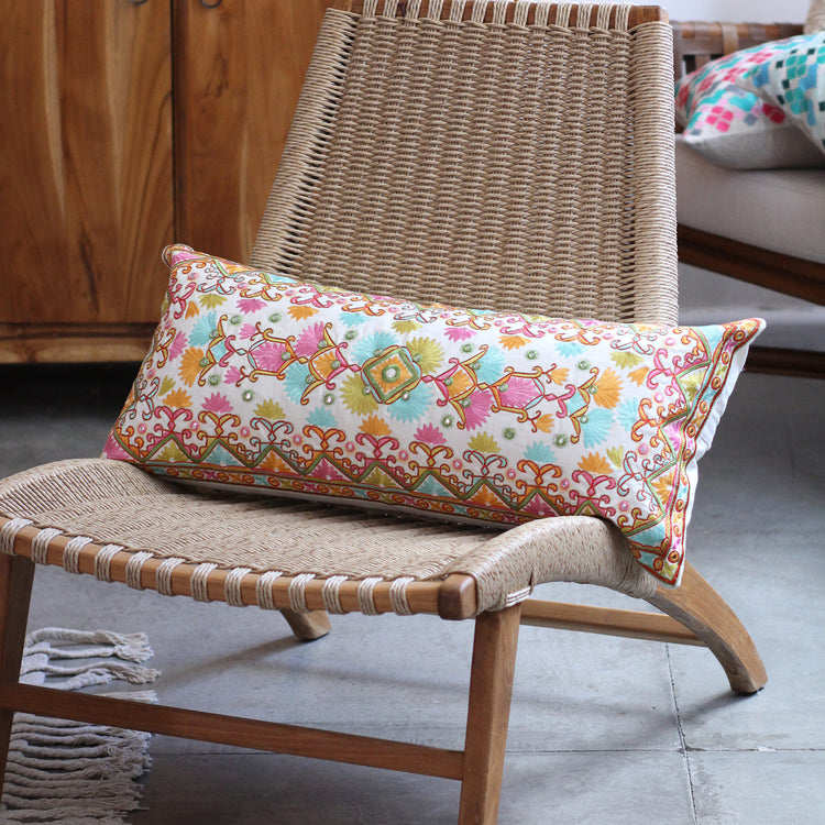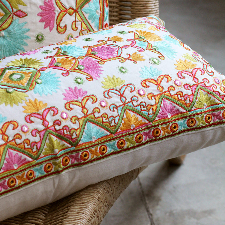 Produzida no Rajastão em 100% algodão, a Capa de Almofada Malay Retangular combina bordados manuais delicados com padrões florais e geométricos em tons vibrantes. Inspirada no artesanato tradicional, é uma peça que traz cor e personalidade para decorações aconchegantes e cheias de vida.