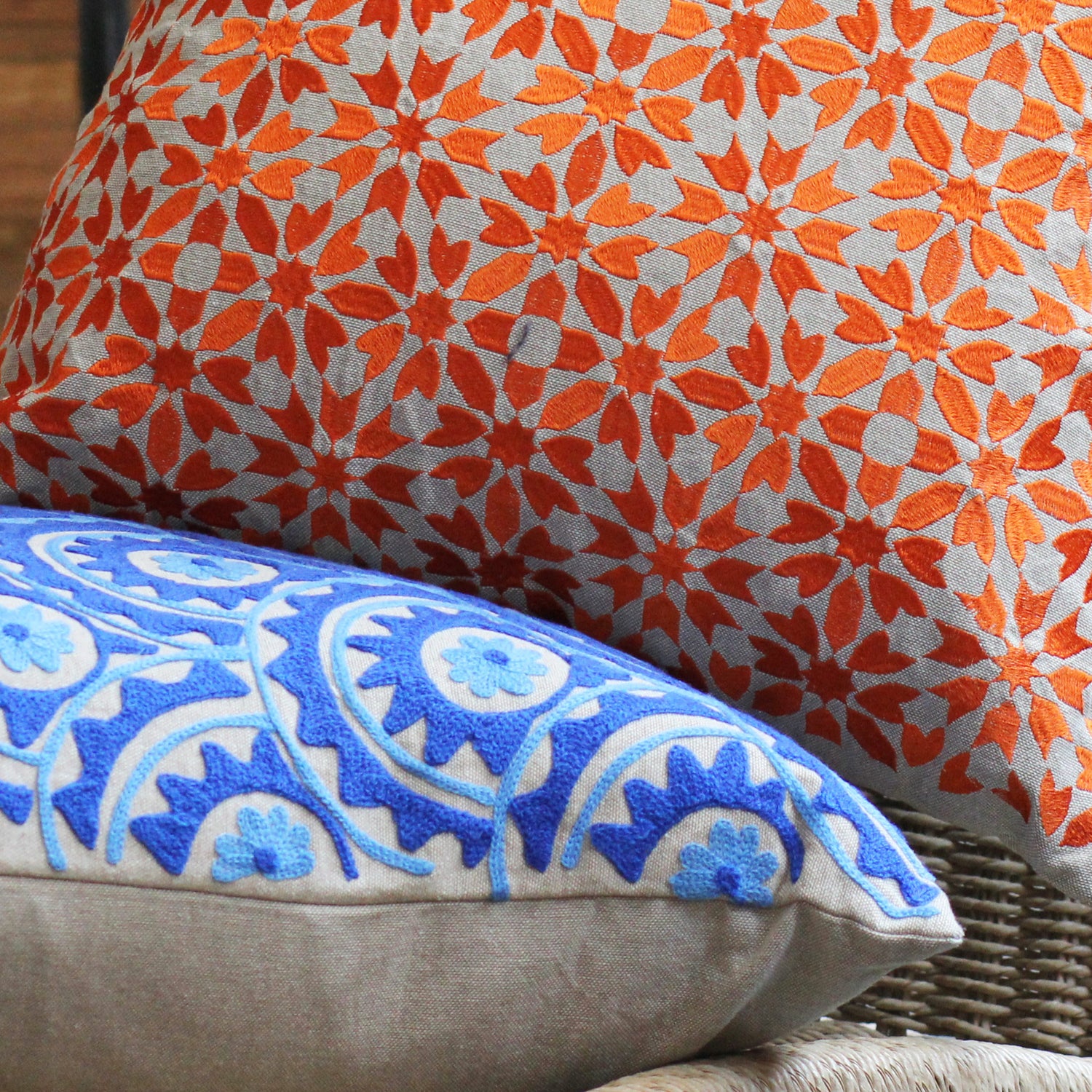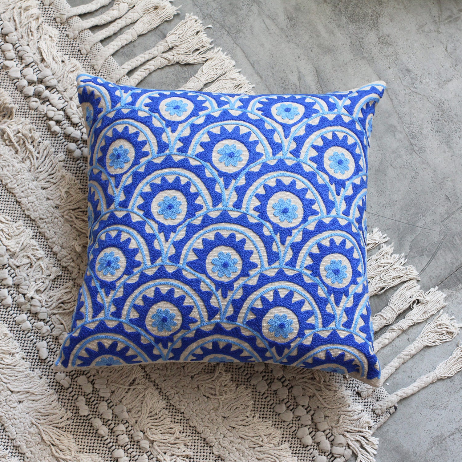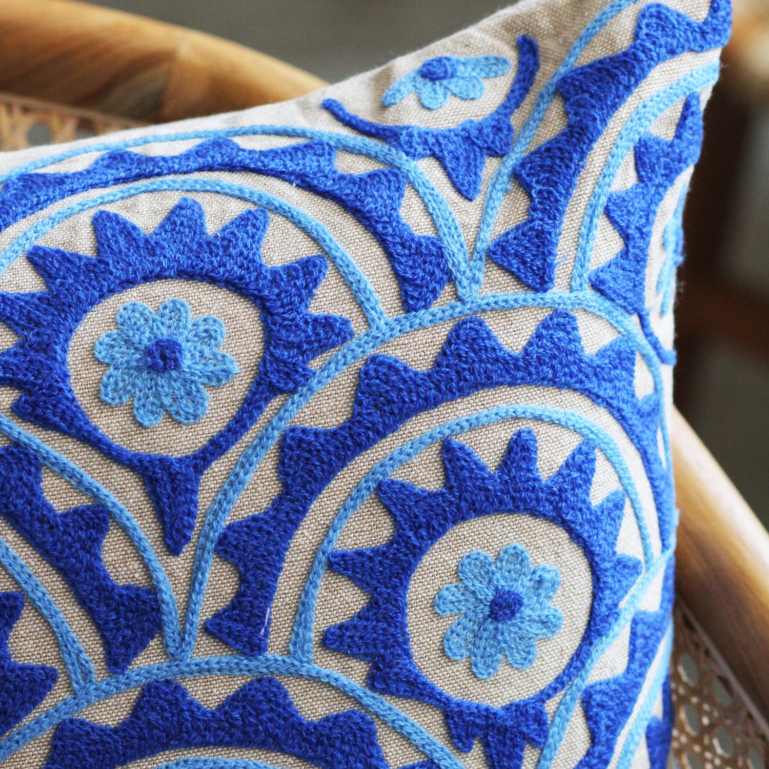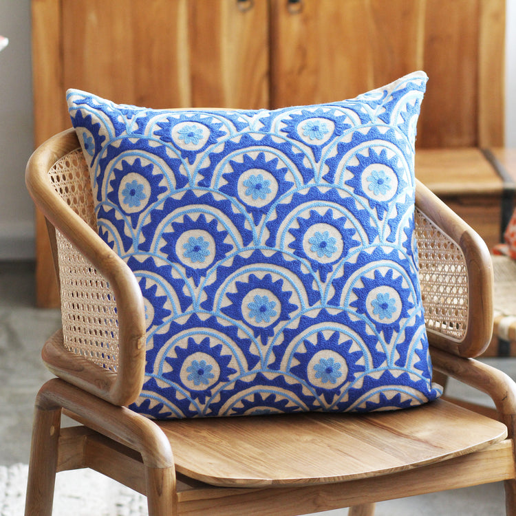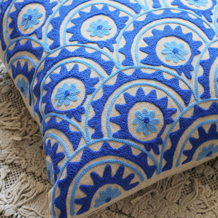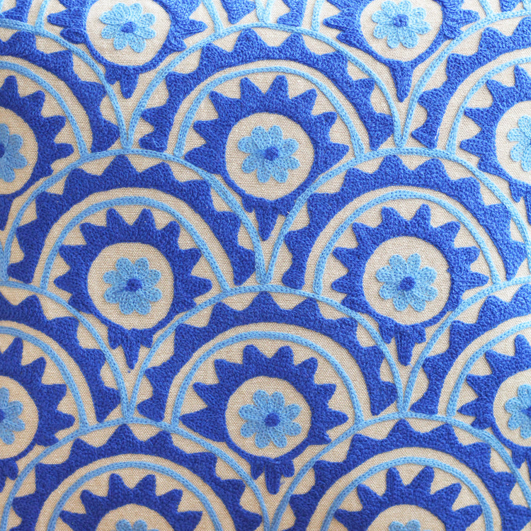 Produzida no Rajastão em 100% algodão, a Capa de Almofada Neela apresenta bordados manuais com padrões florais em tons de azul. Inspirada no artesanato tradicional da região.