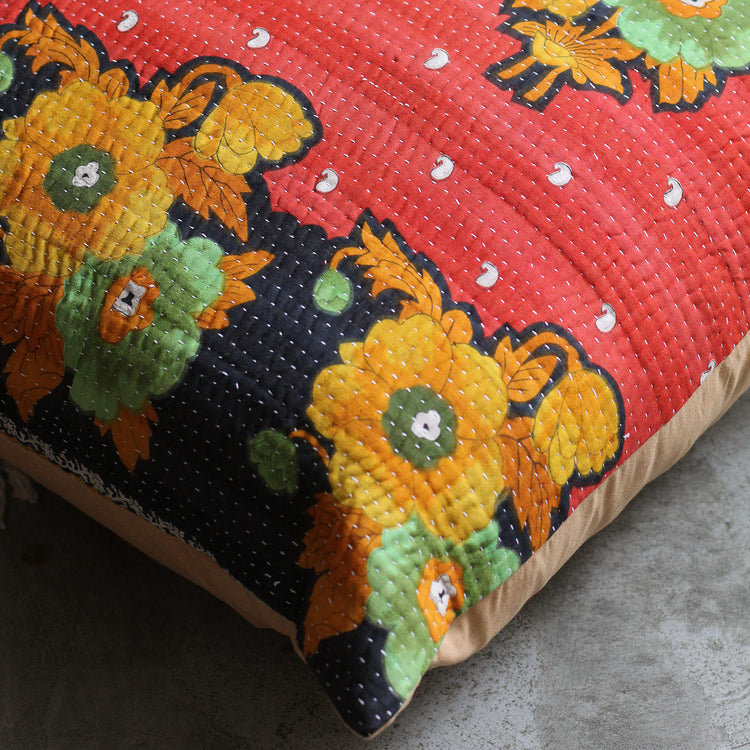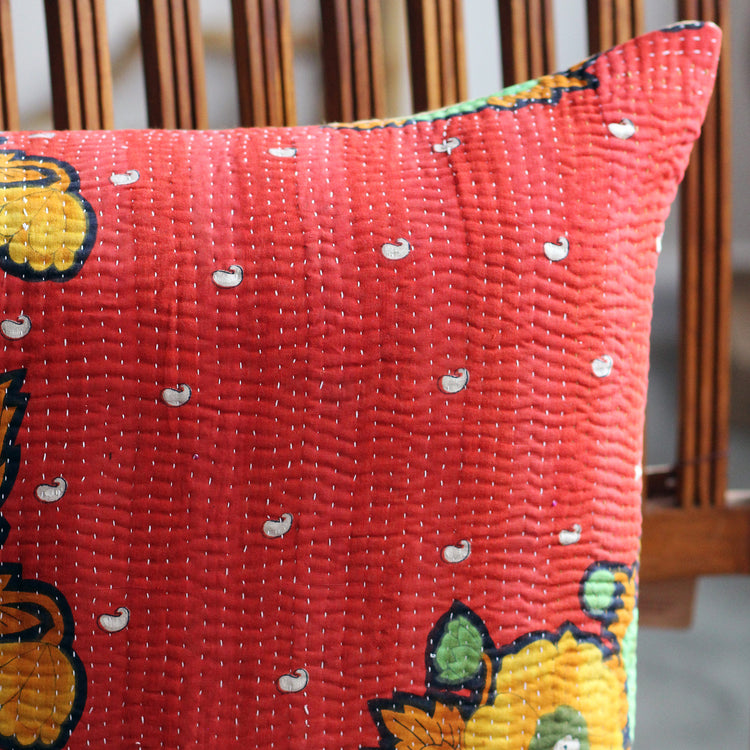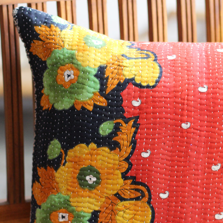 Capa de Almofada Pushpa Surya traz a rica tradição artesanal do Rajastão Indiano em cada detalhe. Exibe um fundo vibrante em vermelho, adornado por delicados motivos brancos e um contraste de preto, ela se destaca pela textura em pespontos que percorrem toda a superfície criadas com a técnica de bordado kantha.