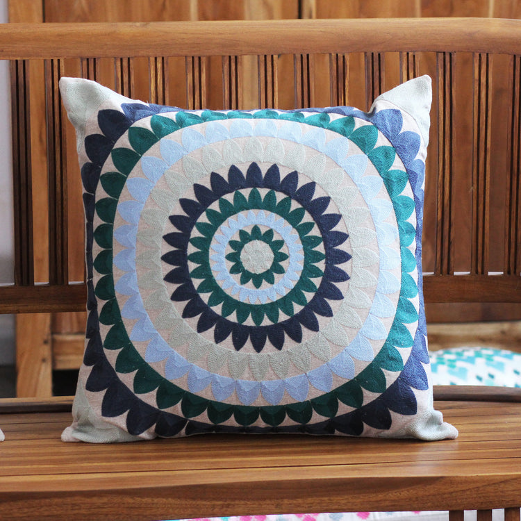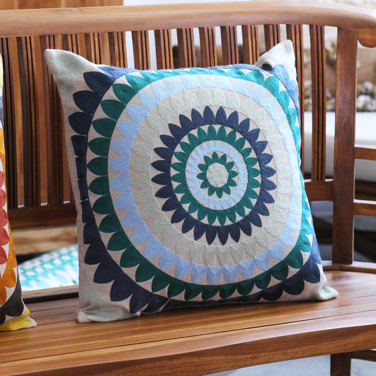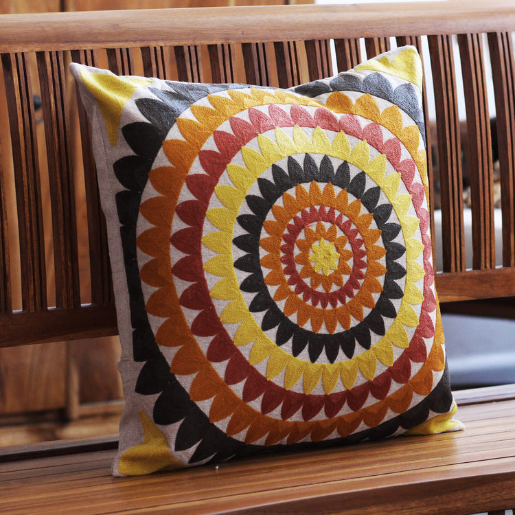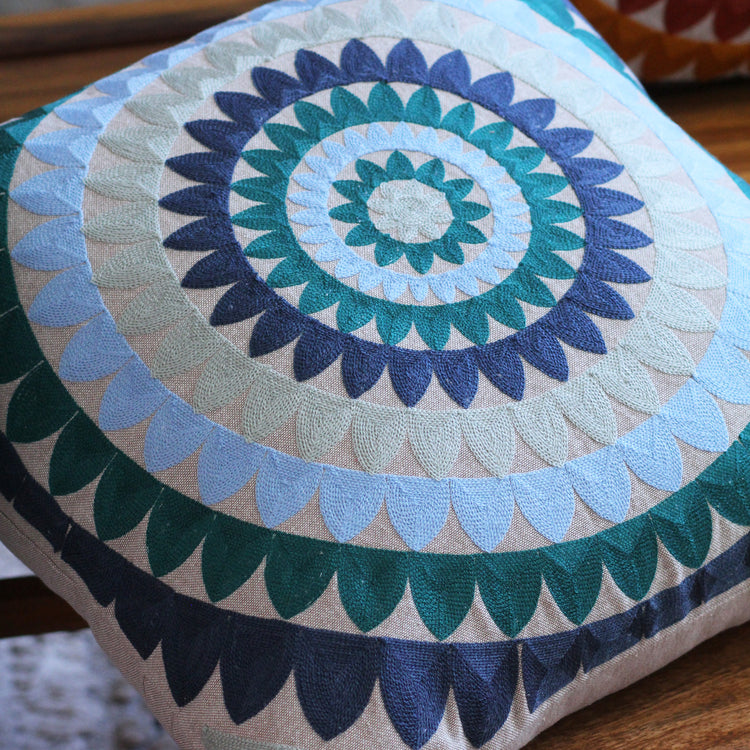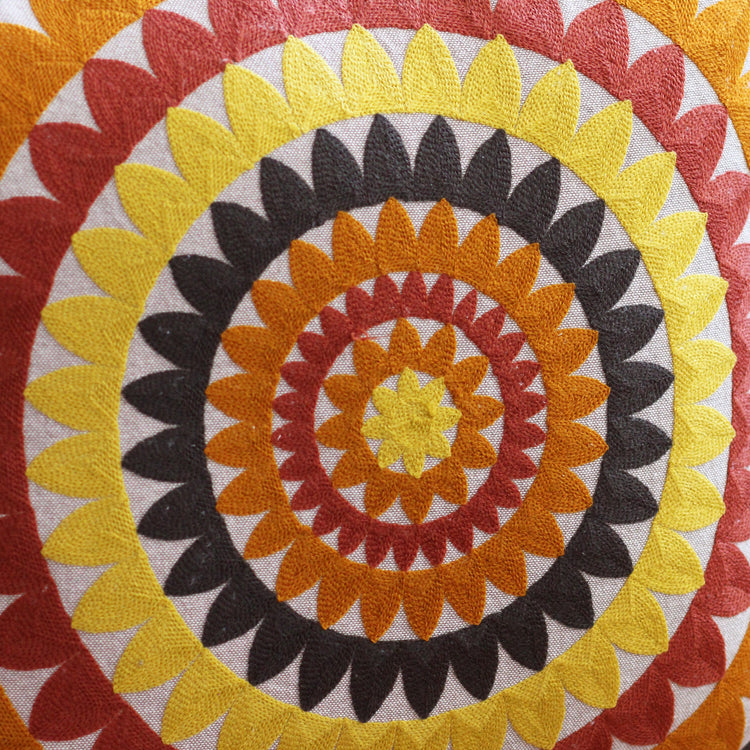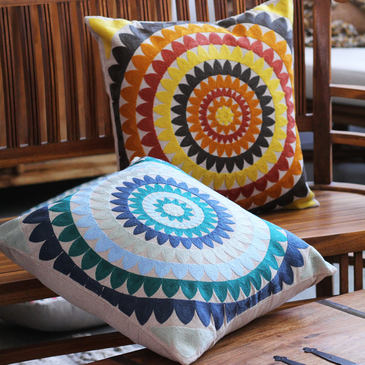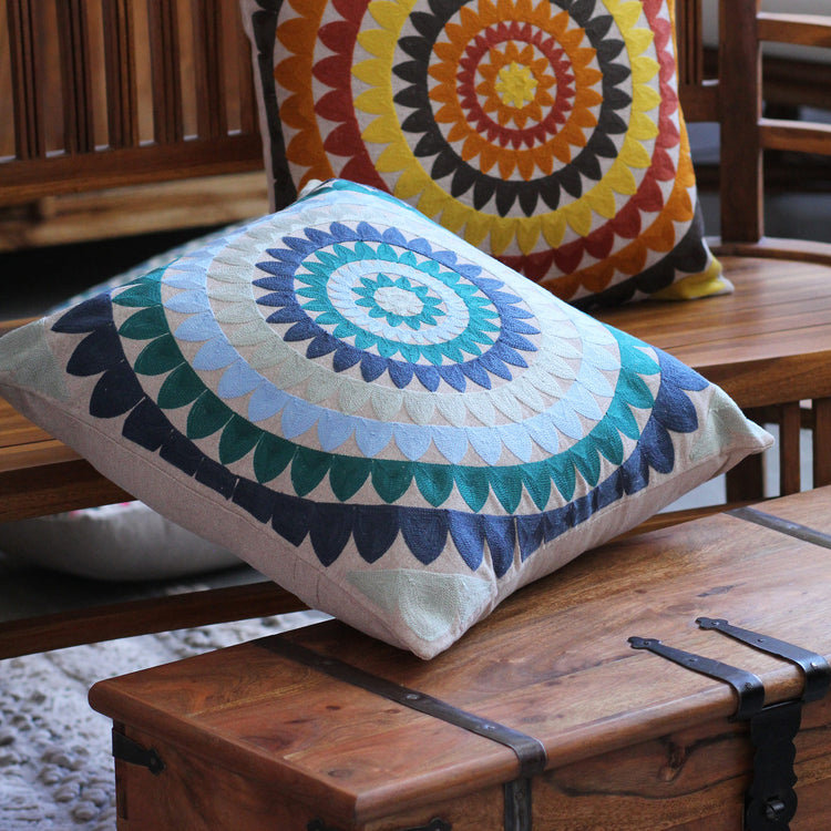 Produzida no Rajastão em 100% algodão, a Capa de Almofada Sooraj apresenta bordados manuais com padrões circulares inspirados no artesanato local. Seus tons vibrantes trazem personalidade ao ambiente, refletindo a tradição cultural da região.