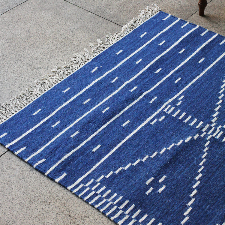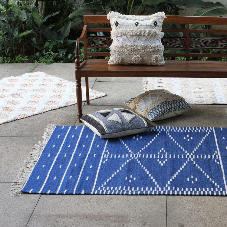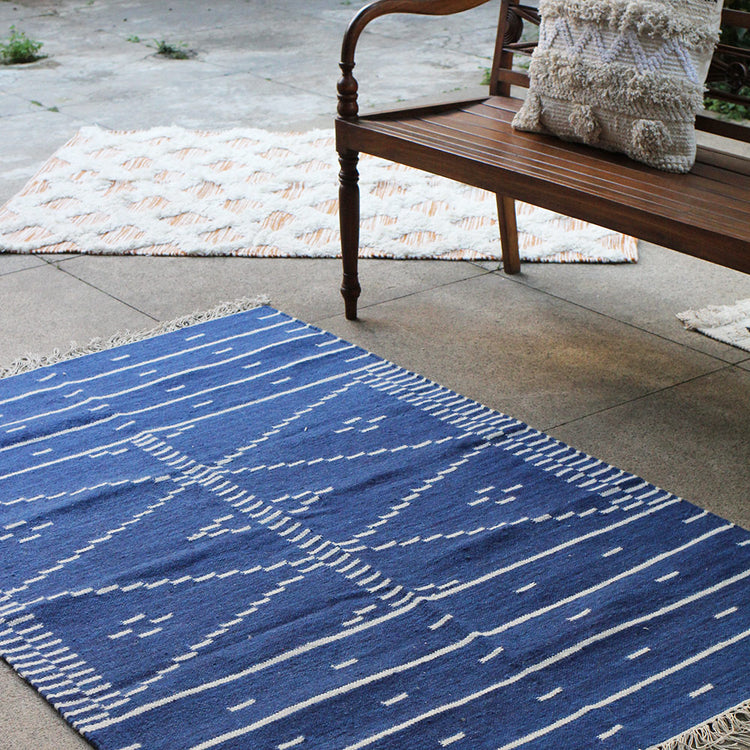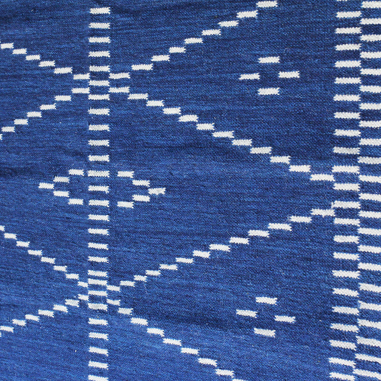 O tapete Kaled apresenta fundo azul indigo e motivos contrastando em branco. Sua construção é bem fechada e firme, natural dos tapetes em lã de qualidade. Um lindo clássico que proporciona equilíbrio e harmonia em qualquer ambiente. Produzido em teares manuais de forma artesanal no Rajastão Indiano.