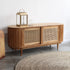 O Rack Tirta tem e duas portas centrais de correr, com estrutura e detalhes em madeira teca e palhinha.