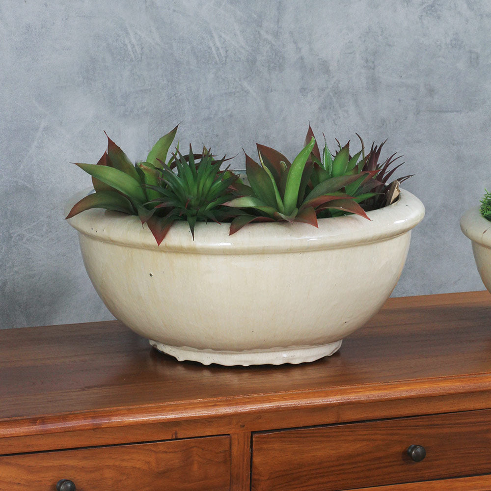 Vaso Anong Creme cerâmico esmaltado vitrificado, produzido artesanalmente com as tradicionais técnicas no Vietnam. Muito resistentes e duráveis, os vasos vietnamitas podem ficar no tempo ou serem usados em áreas internas. Os padrões de queima podem variar tornando cada vaso único.